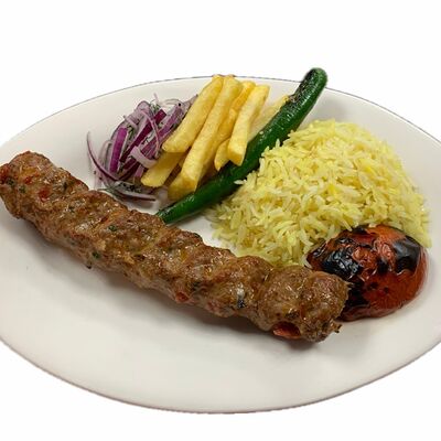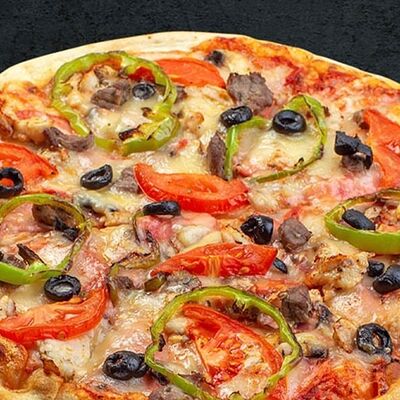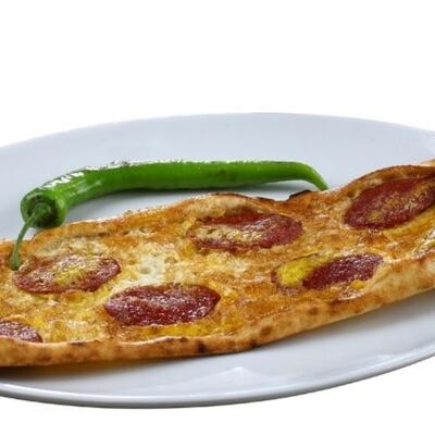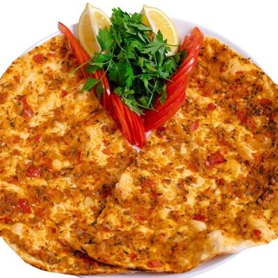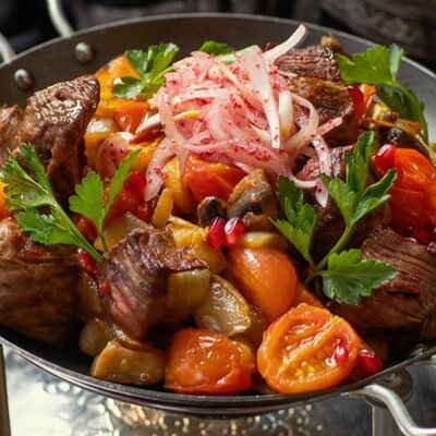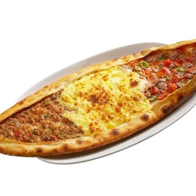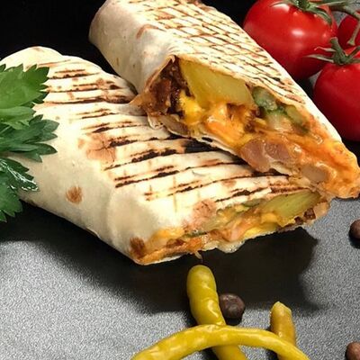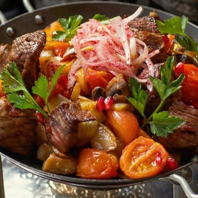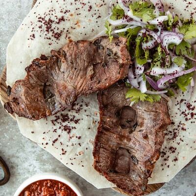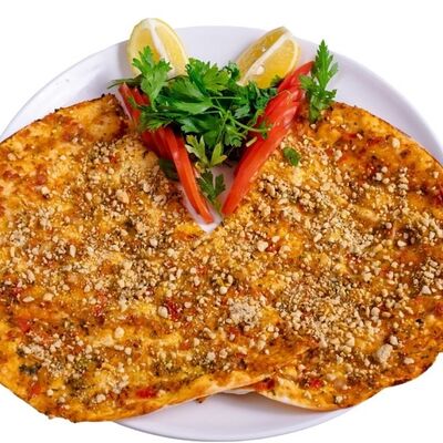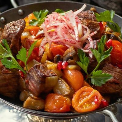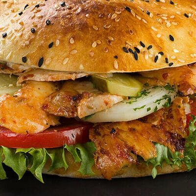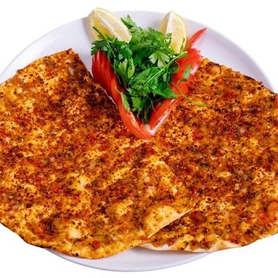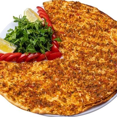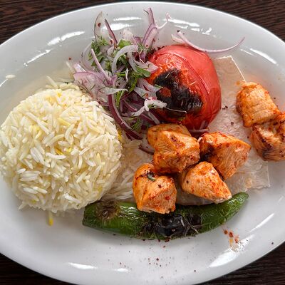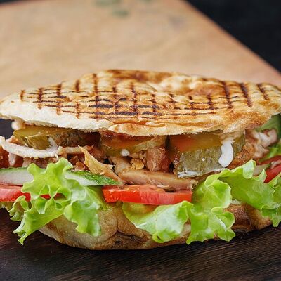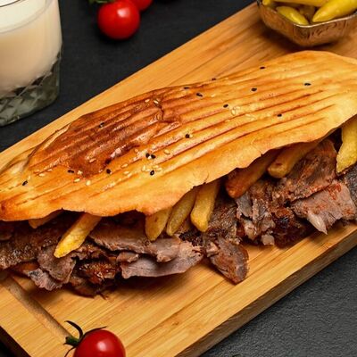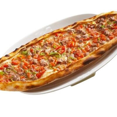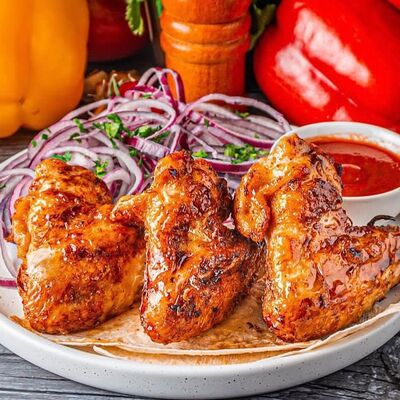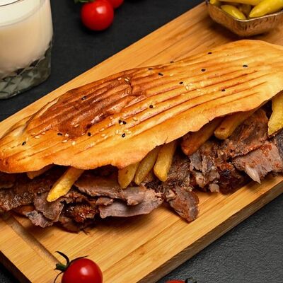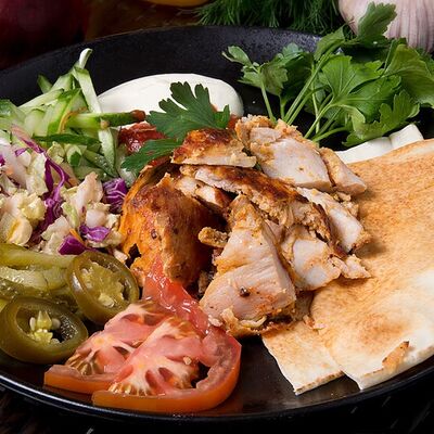 Курица, пиде, помидоры, картофель фри, сумах, лук, перец на гриле
