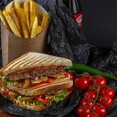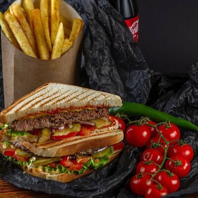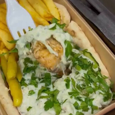 Филе курицы, лаваш армянский тандырный, капустный салат, картофель фри, помидор, гранат, авторский соус, свежий огурец