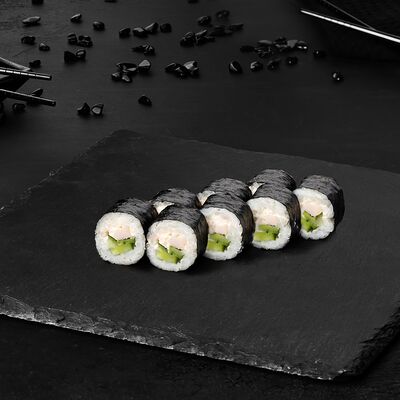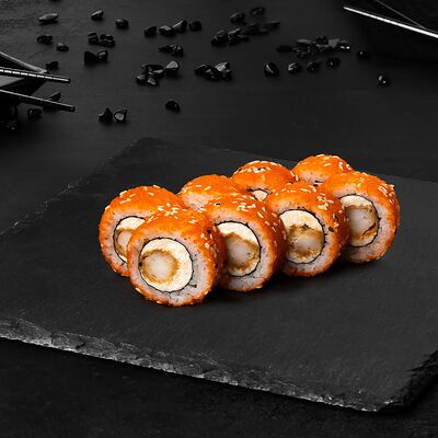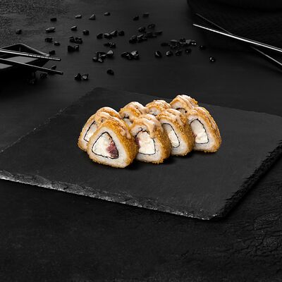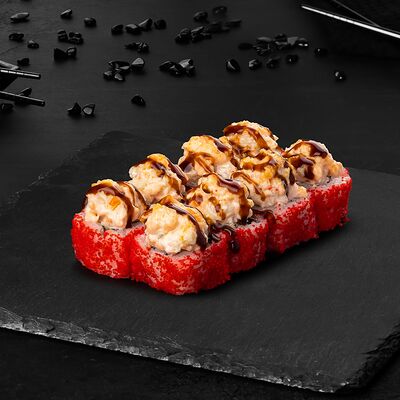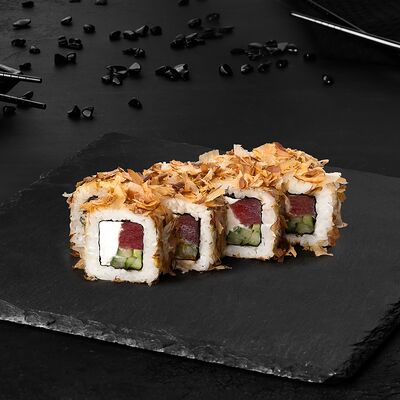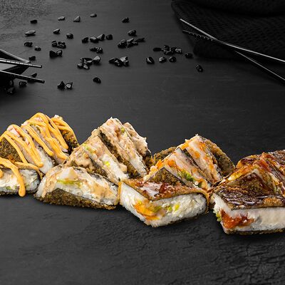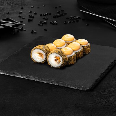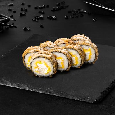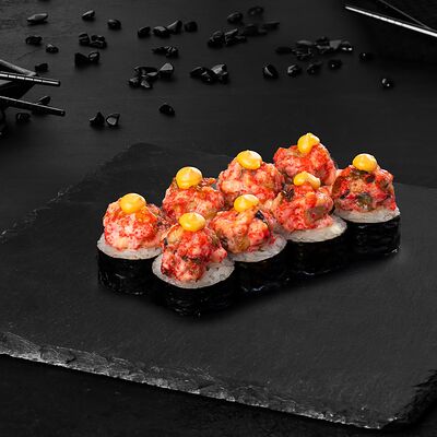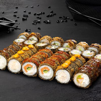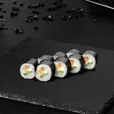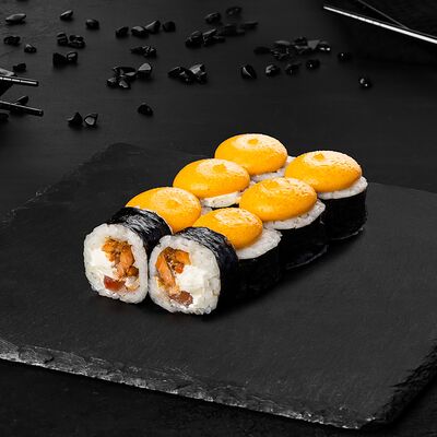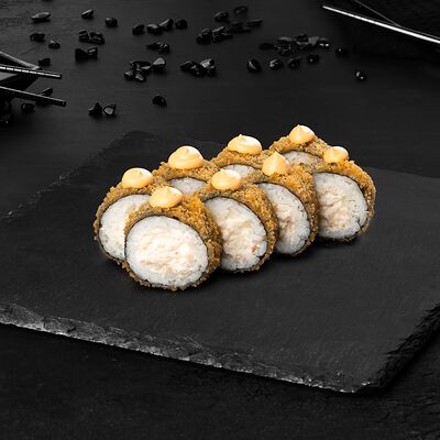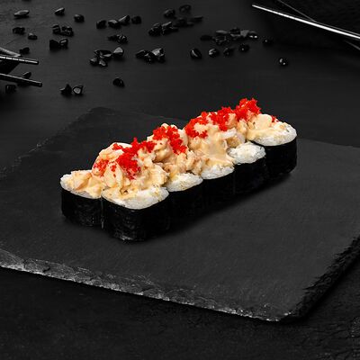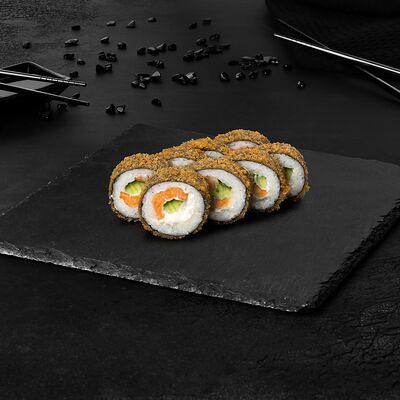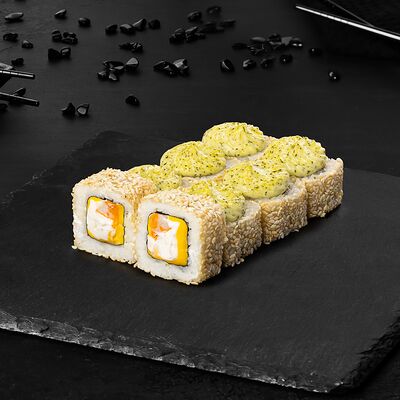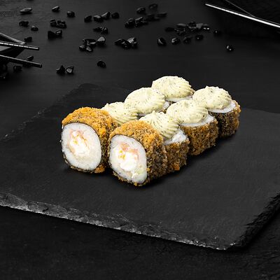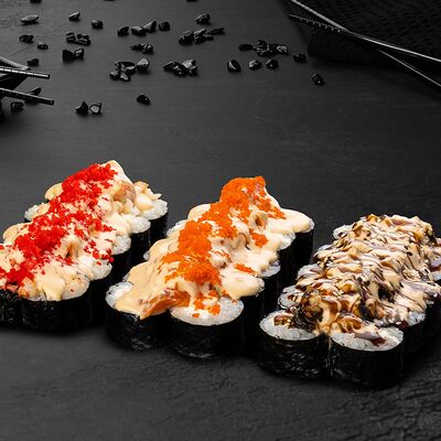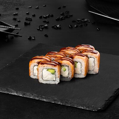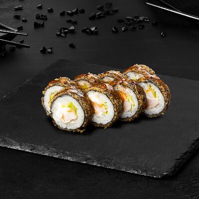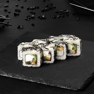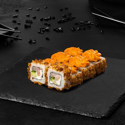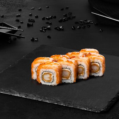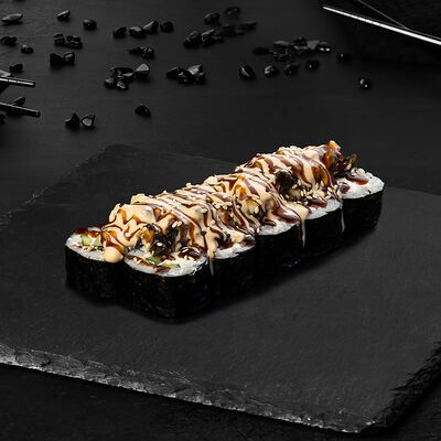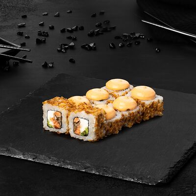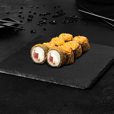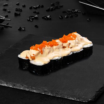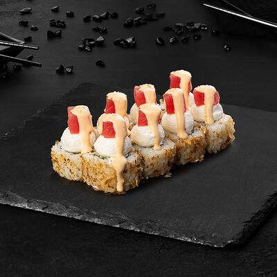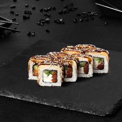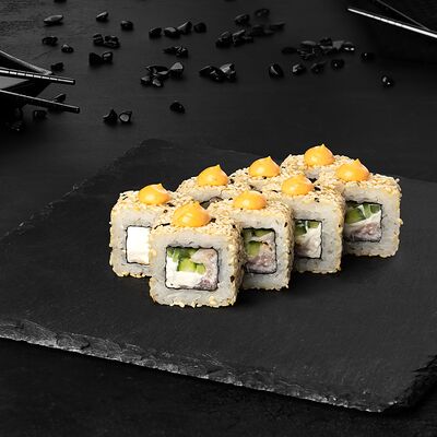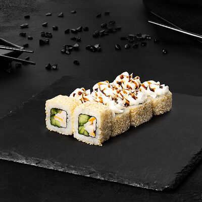 Рис, нори, творожный сыр, огурец, бекон, кунжут, спайси соус