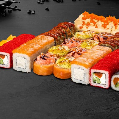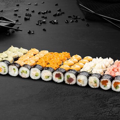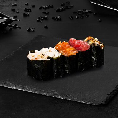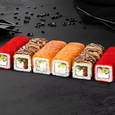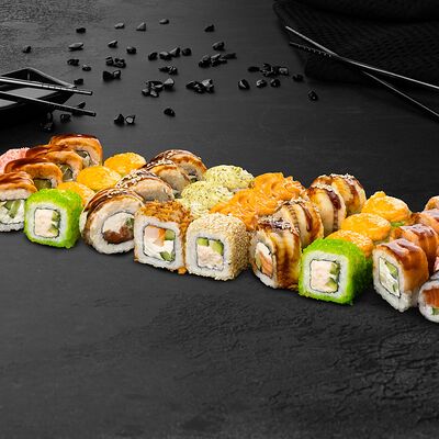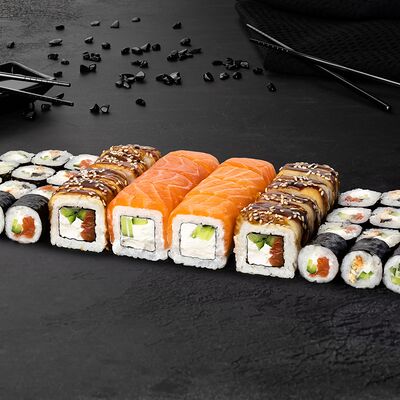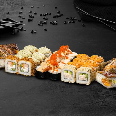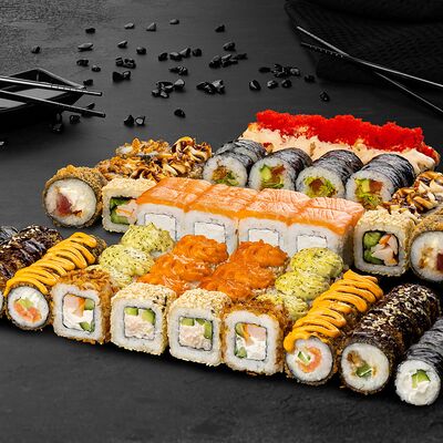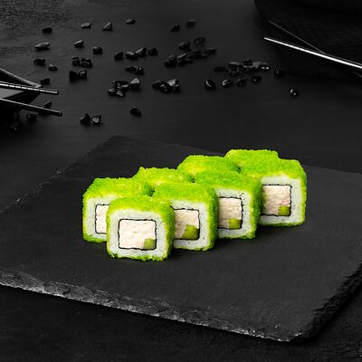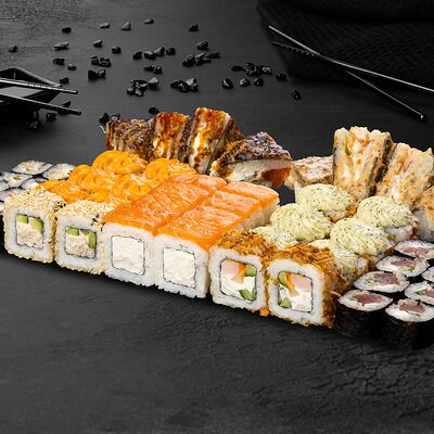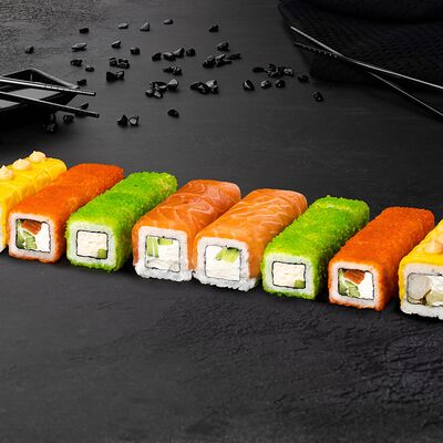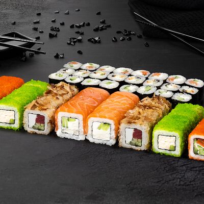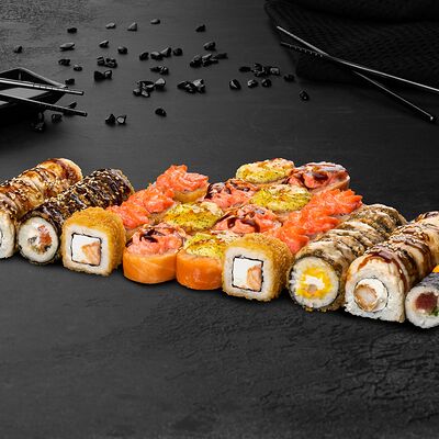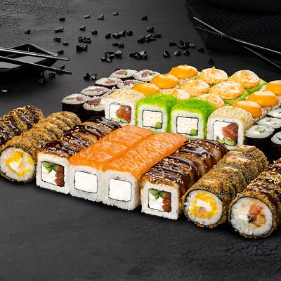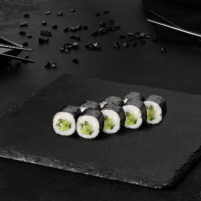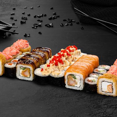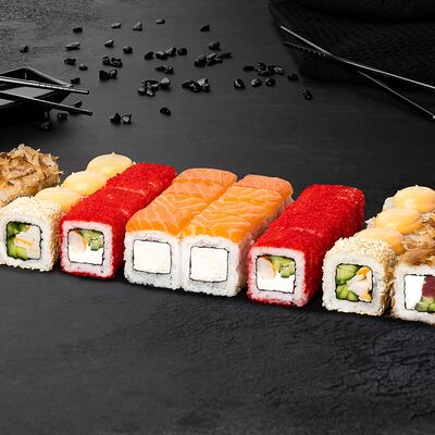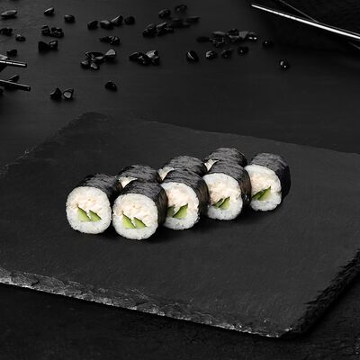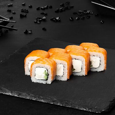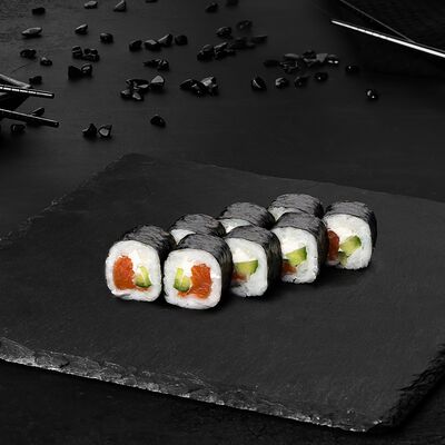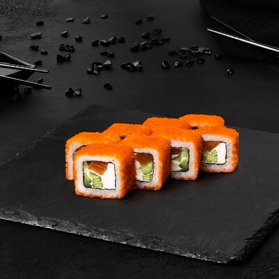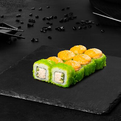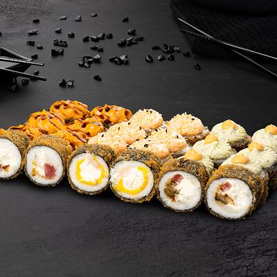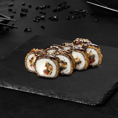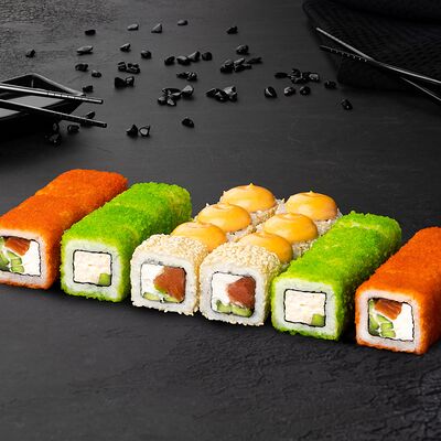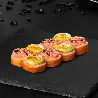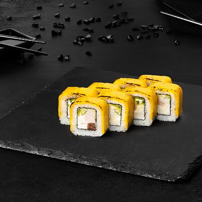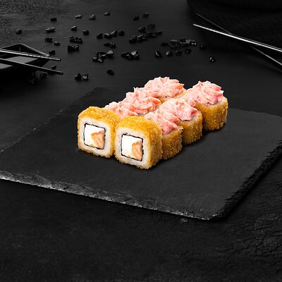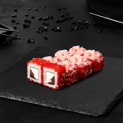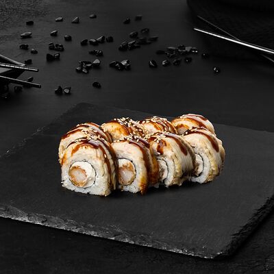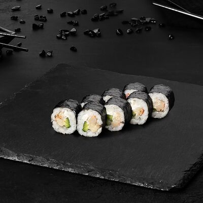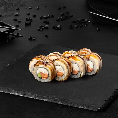 Рис, нори, творожный сыр, огурец, бекон, кунжут, спайси соус