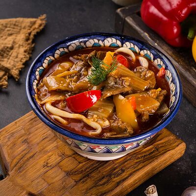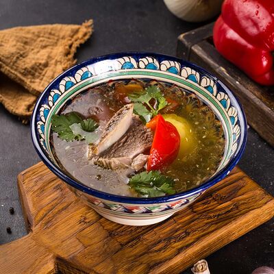 Наваристая баранина, морковь, картошка, болгарский перец, лук репчатый, соль, перец горошком, укроп