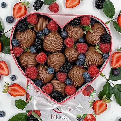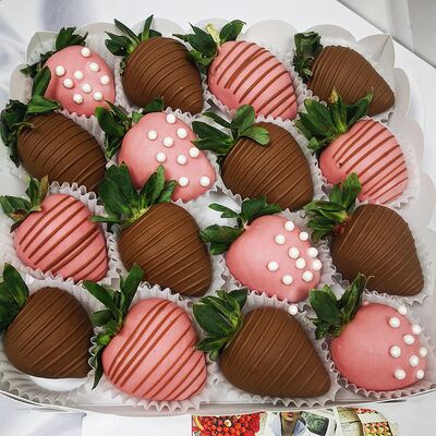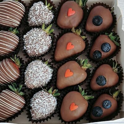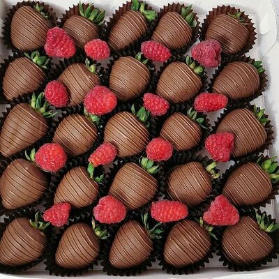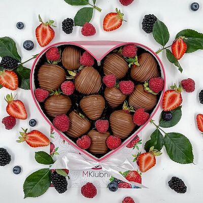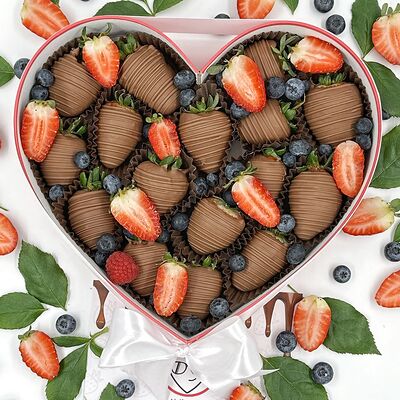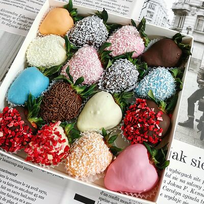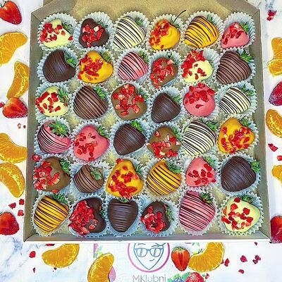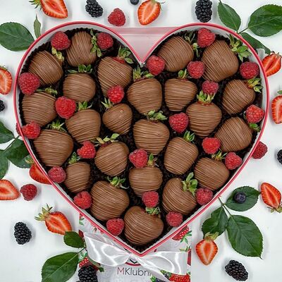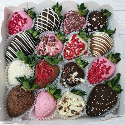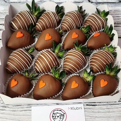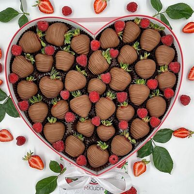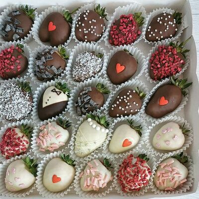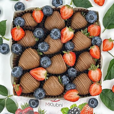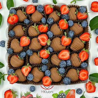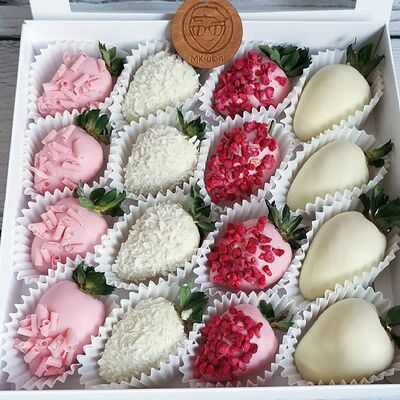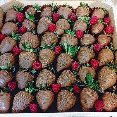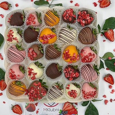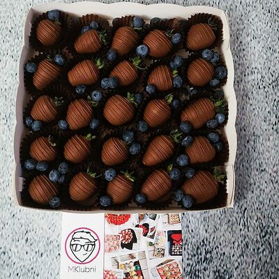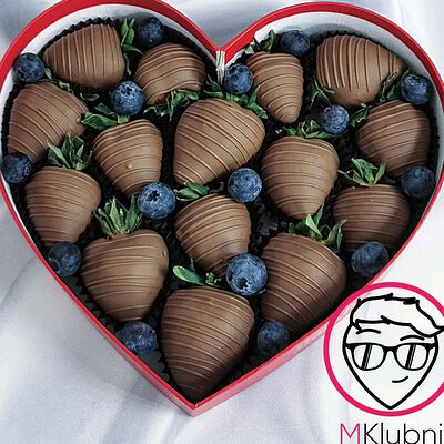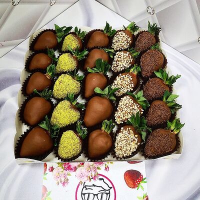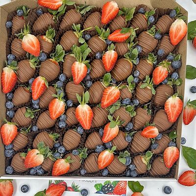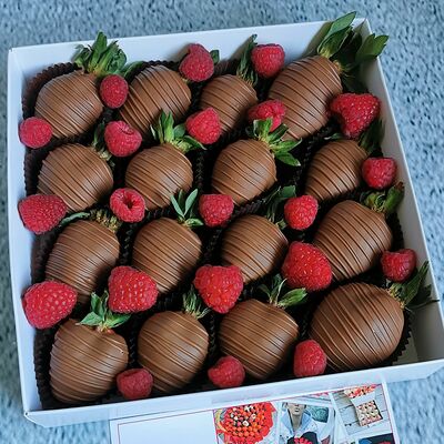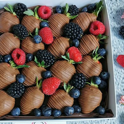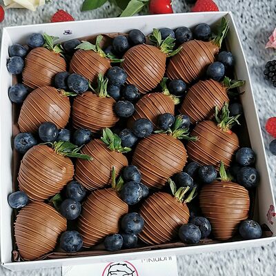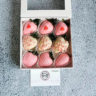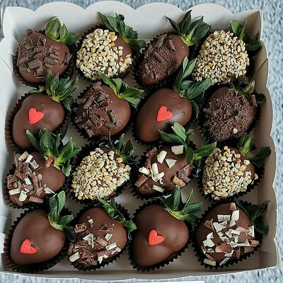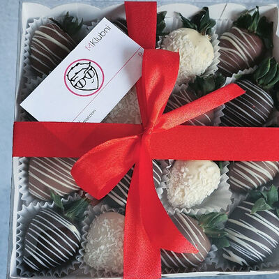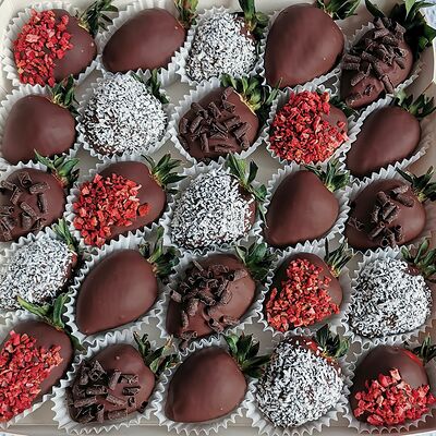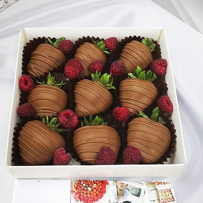 Отборная спелая клубника в натуральном бельгийском шоколаде (16-25 шт.; зависит от размера клубники) подарочная коробка (20х20х4 см) с прозрачной крышкой и бантиком, подарочный пакет