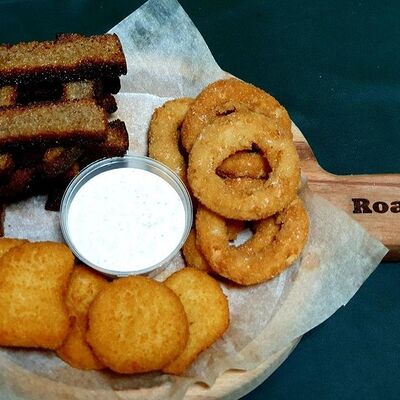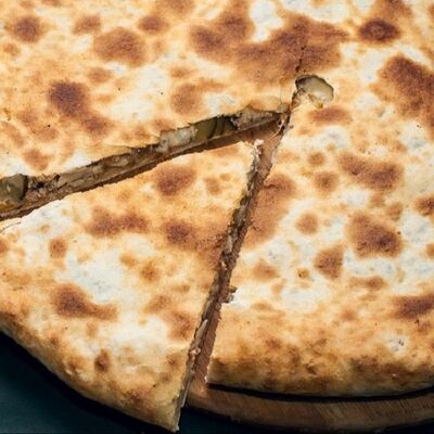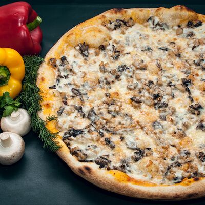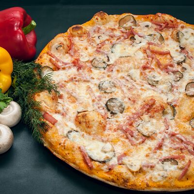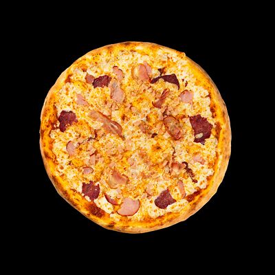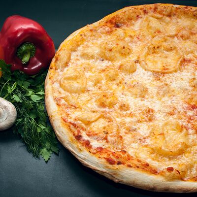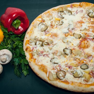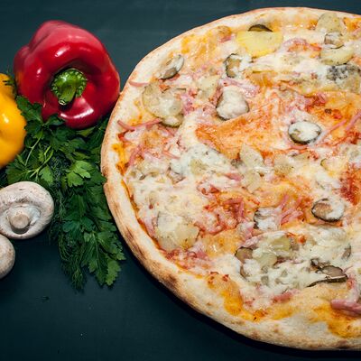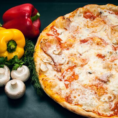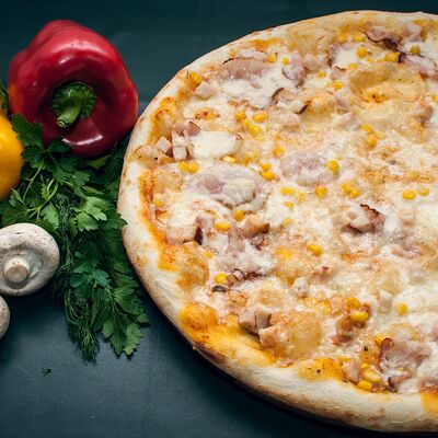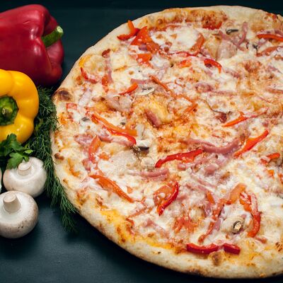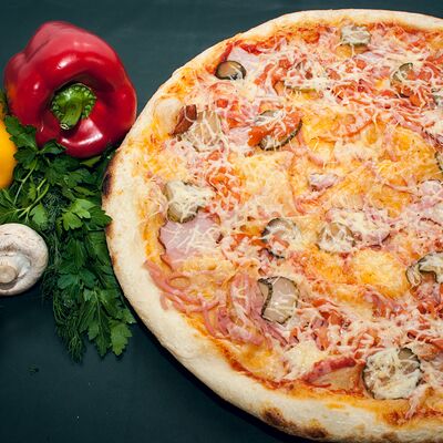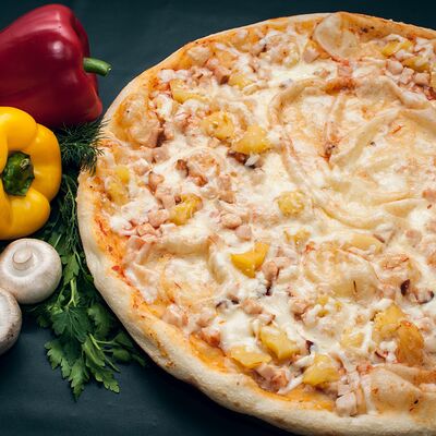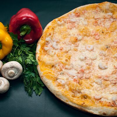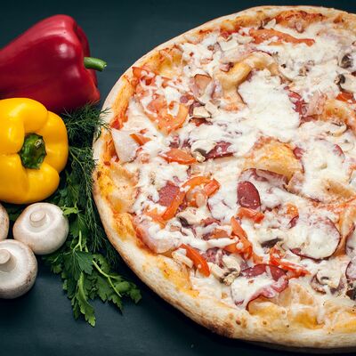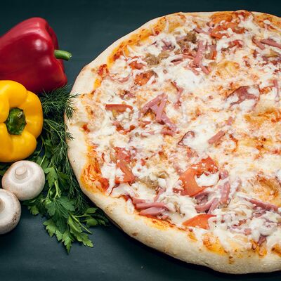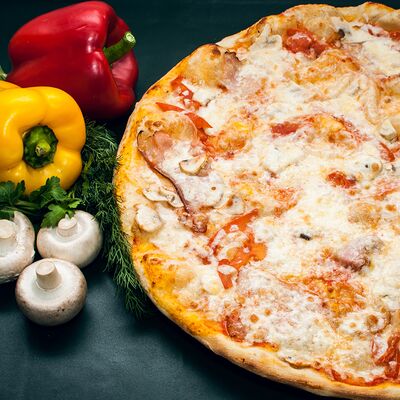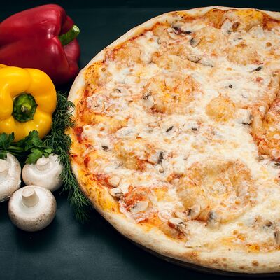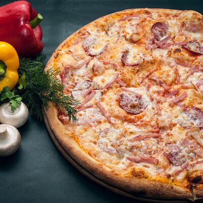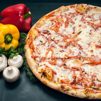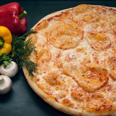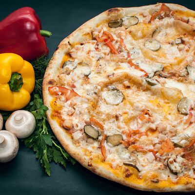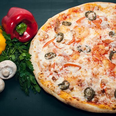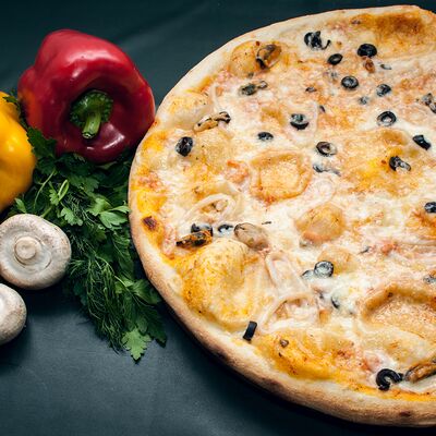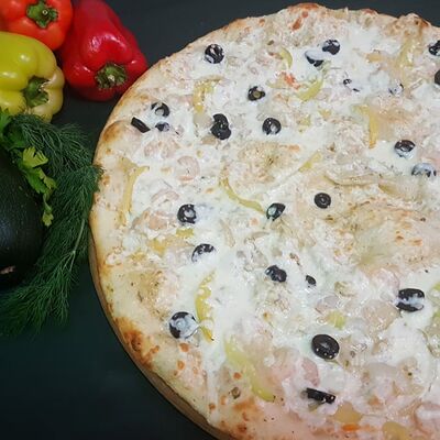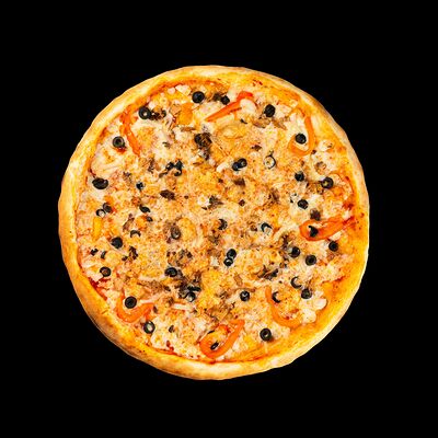 Соус печеные томаты, сыр моцарелла, тунец, маслины, помидоры, зелень, лосось, лук репчатый (20 см)
