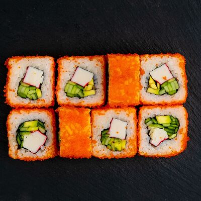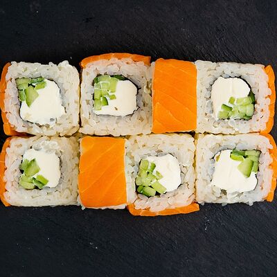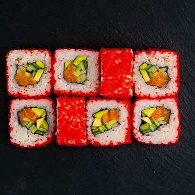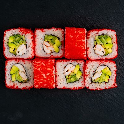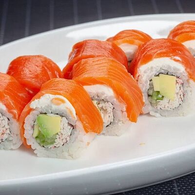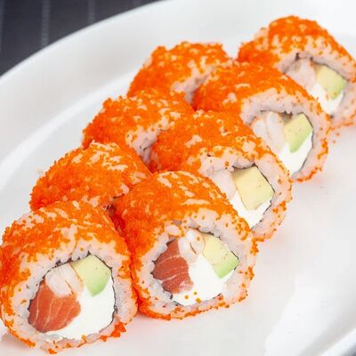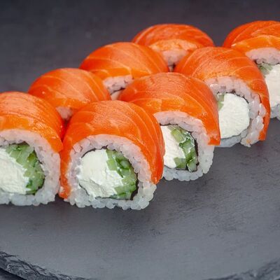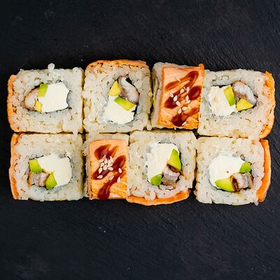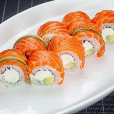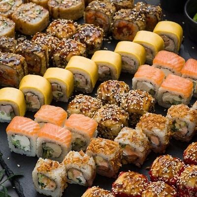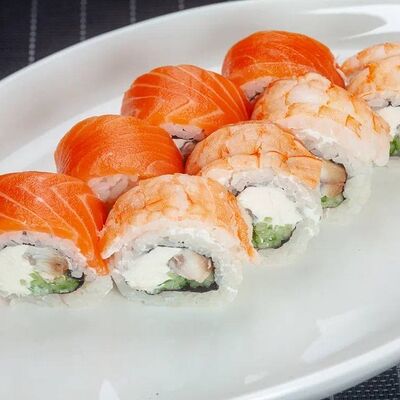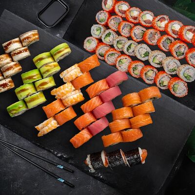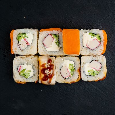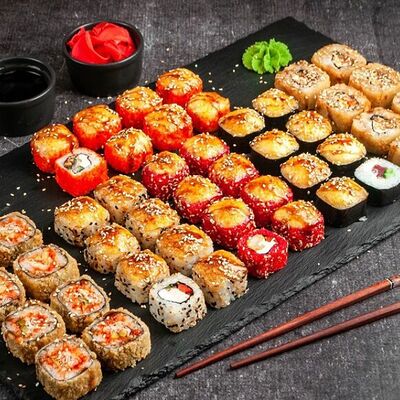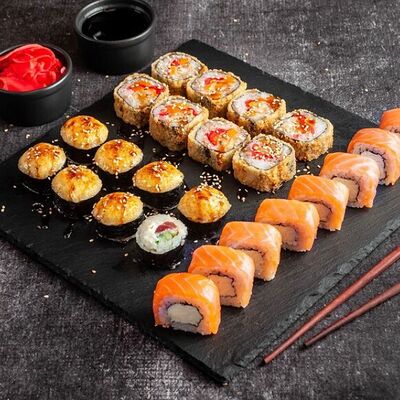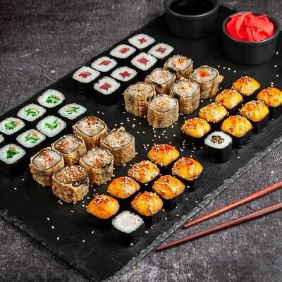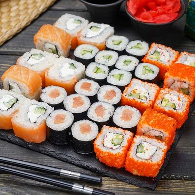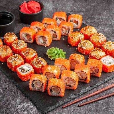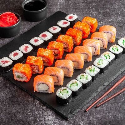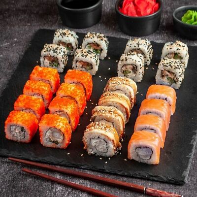 Ролл Филадельфия, ролл Калифорния с крабом, ролл с кунжутом Классический с лососем, ролл с тигровой креветкой с огурцом, тунец, чука (32 шт.)