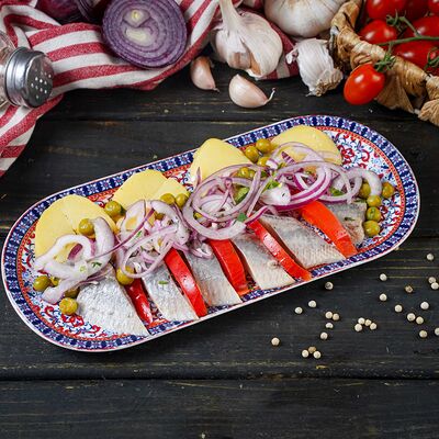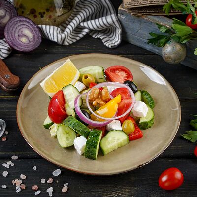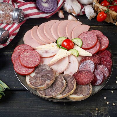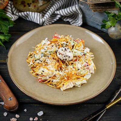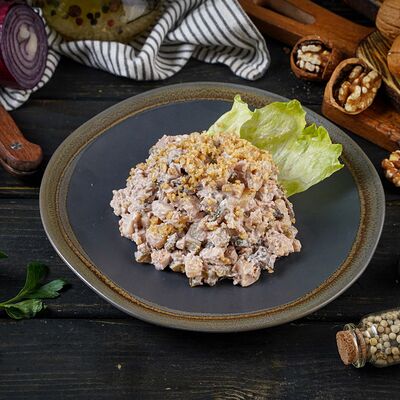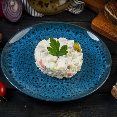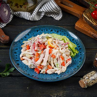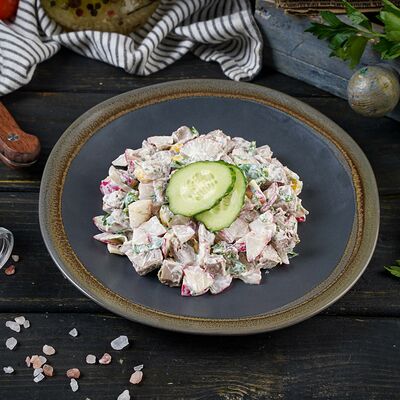 Говяжий язык, огурец, редис, кукуруза, заправлен майонезом