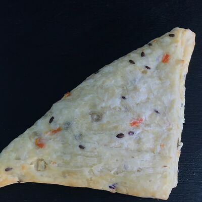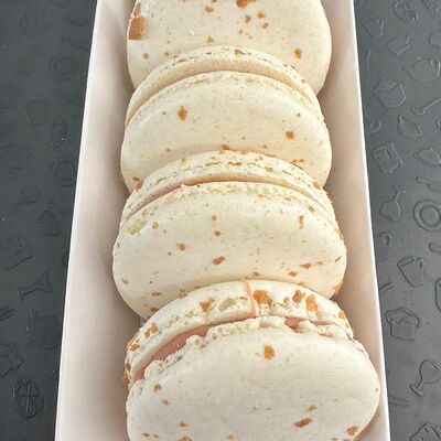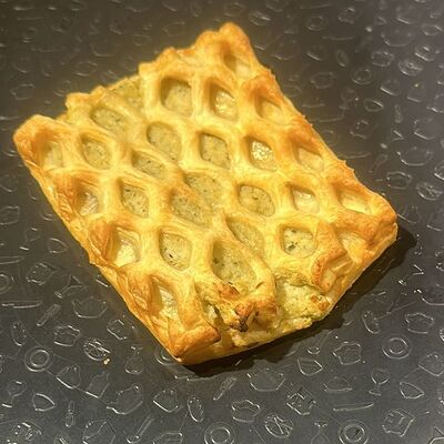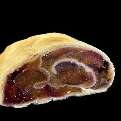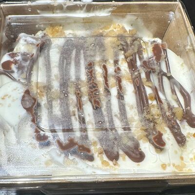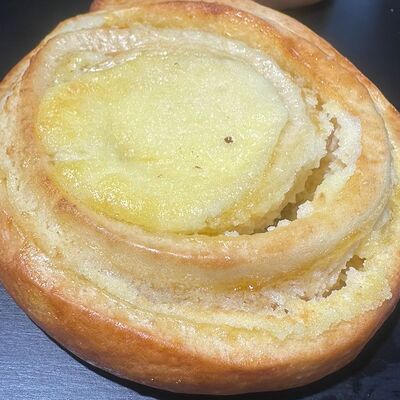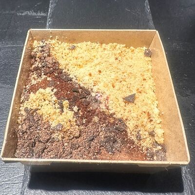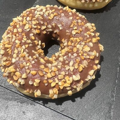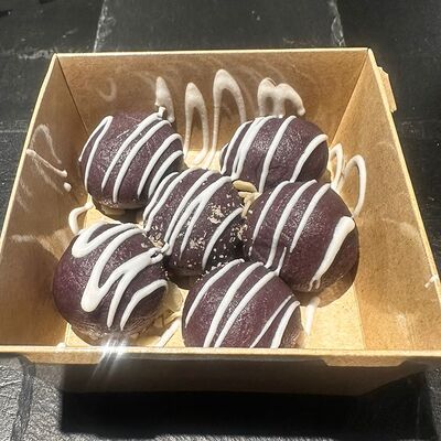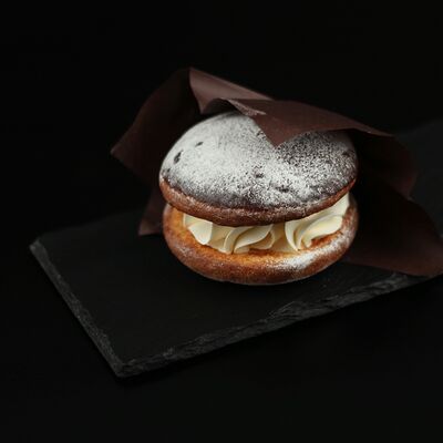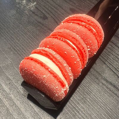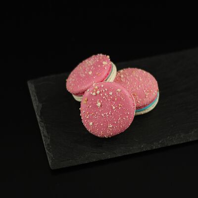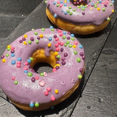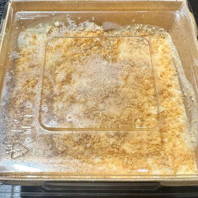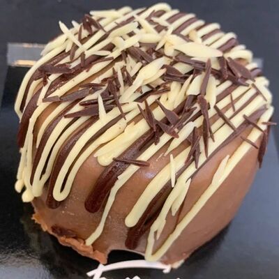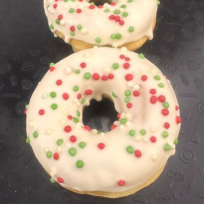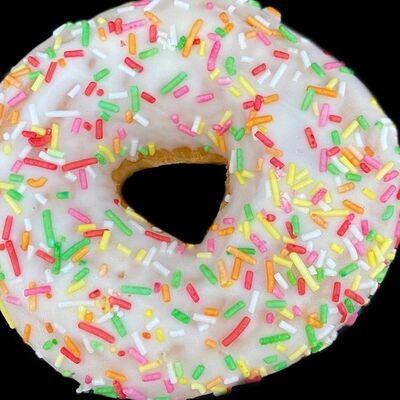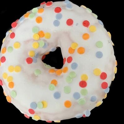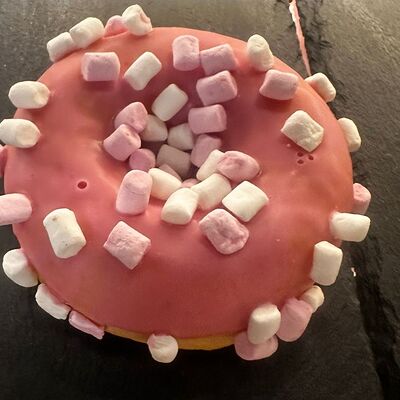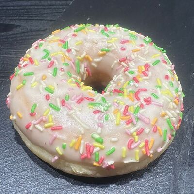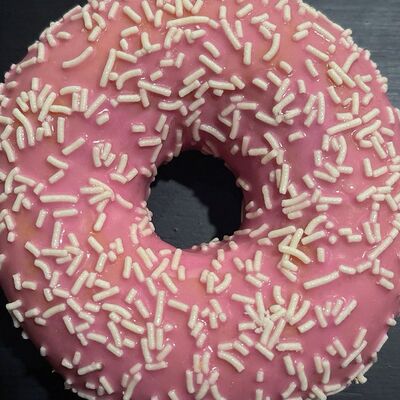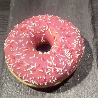 Тесто (мука пшеничная, пальмовое масло, маргарин, сахар, дрожжи, соль, эмульгаторы: моно- и диглицериды жирных кислот, эфиры глицерина и диацетилвинной и жирных кислот, стеароил-2-лактилат натрия; разрыхлители: дигидропирофосфат натрия, гидрокарбонат натрия; декстроза, стабилизатор: гуаровая камедь; сухая молочная сыворотка, лактоза, антиокислитель: аскорбиновая кислота), глазурь (сахар, растительные жиры, эмульгатор: лецитин; краситель: кармин), посыпка из белого шоколада (сахар, какао масло, сухое цельное молоко, декстроза, эмульгатор: соевый лецитин)