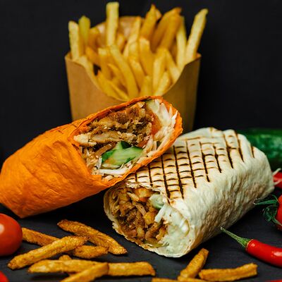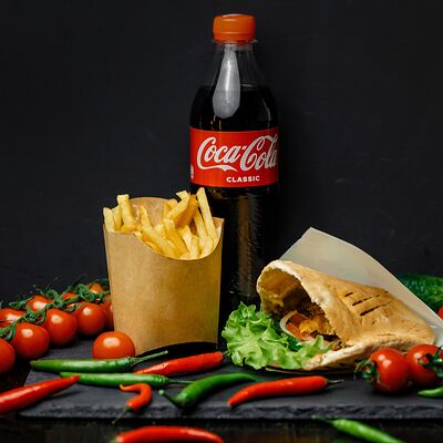 Шаурма в пите, картофель фри, соус на выбор и холодный напит