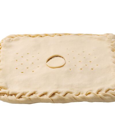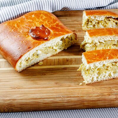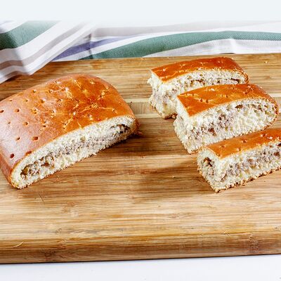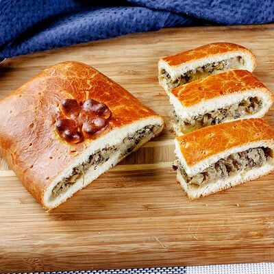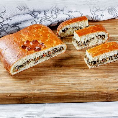 1 кг. Начинка бедро куриное, картофель, лук, маринад (растительные масла, зелень, ароматизатор, сухой молочный жир), соль. Тесто: мука в/с, вода, масло сливочное, молоко сухое, сахар, маргарин