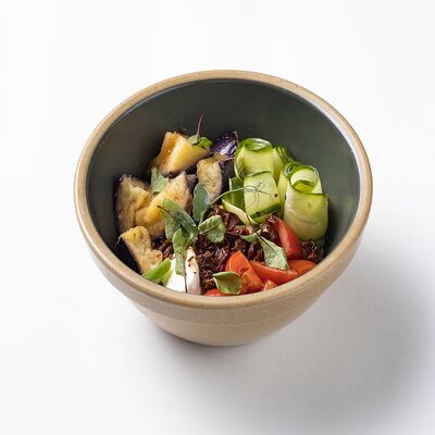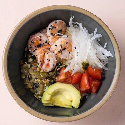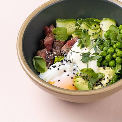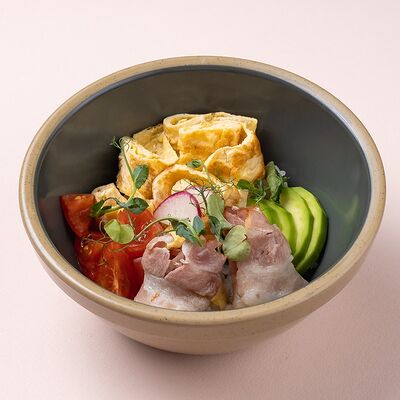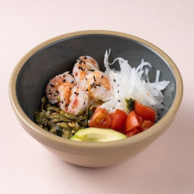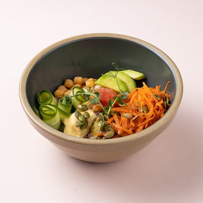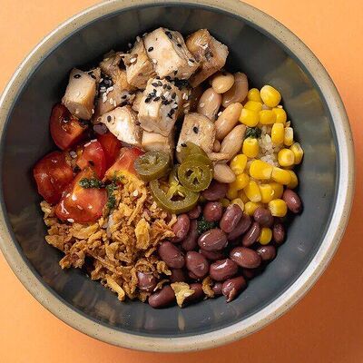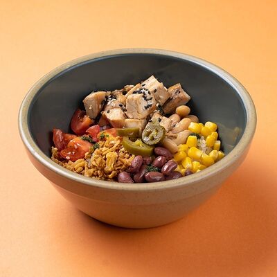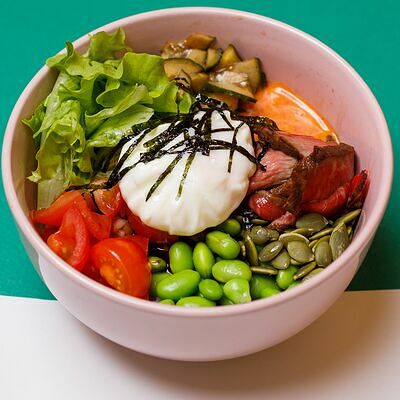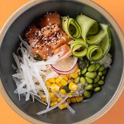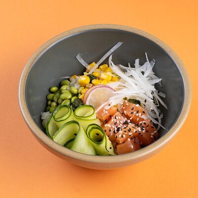 Рис или основа на выбор, лосось, маринованный в апельсиновом фреше, редис, дайкон, кукуруза, свежий огурец, бобы эдамаме, соус айоли, кинза-соус