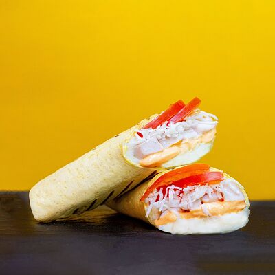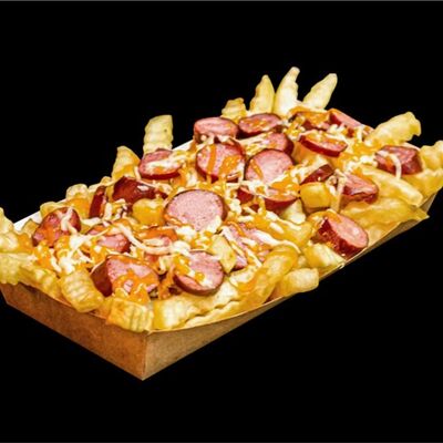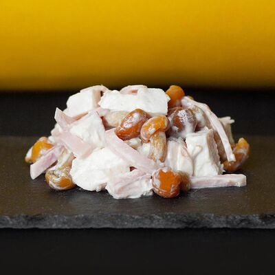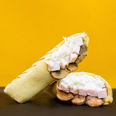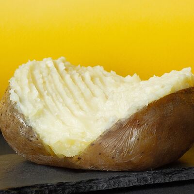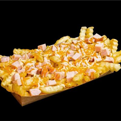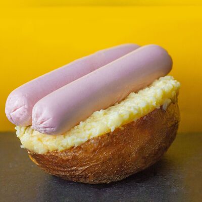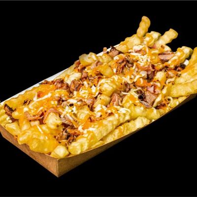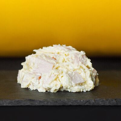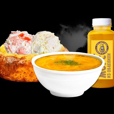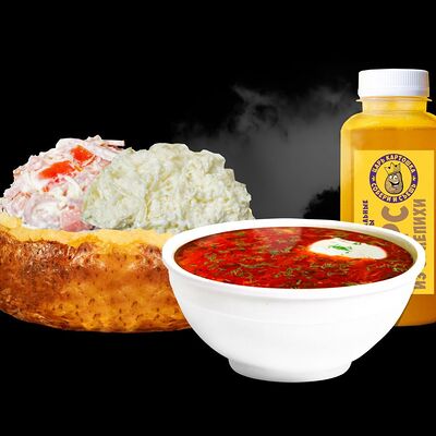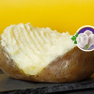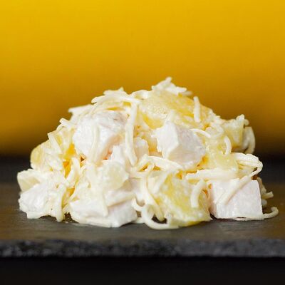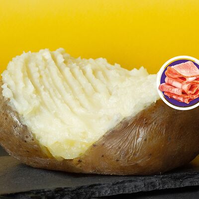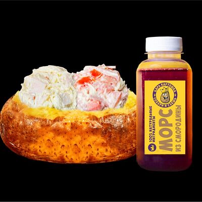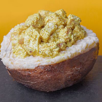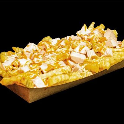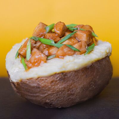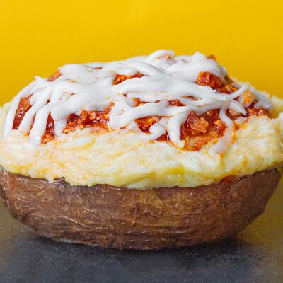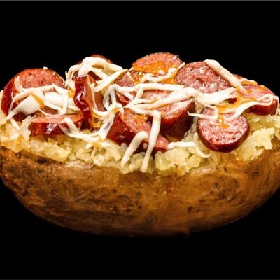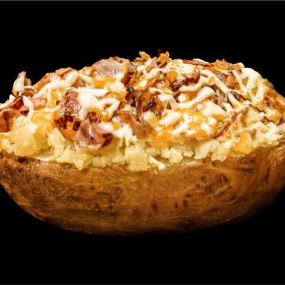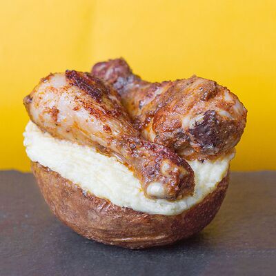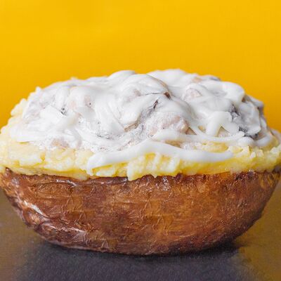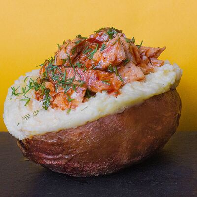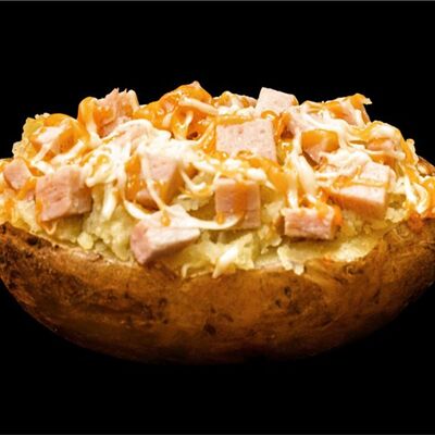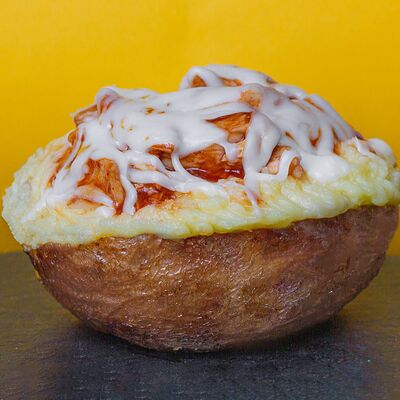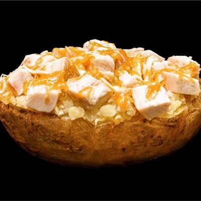 Печёная картошка с копчёной курицей под сыром с соусом на выбор