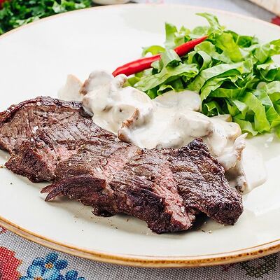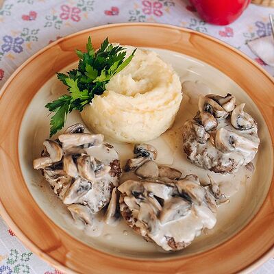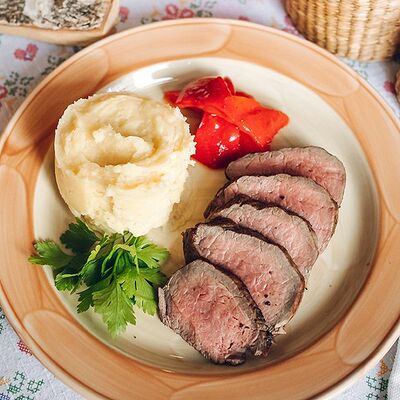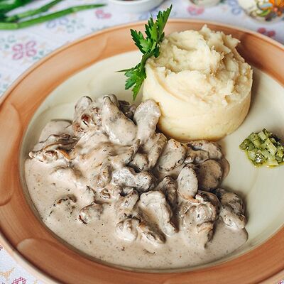 Говядина, томленная в сливках. Подается с картофельным пюре