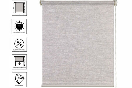 Рулонная штора способна удерживать до 70% проникающего света. Текстиль, лежащий в основе штор, предварительно обрабатывают экологически чистыми антибактериальными средствами и пропитками с пылеотталкивающими свойствами. Изделие устойчиво к выгоранию, влаге и испарениям, отличается стойкостью цвета, замечательно сочетается с различными типами штор и выступает прекрасным дополнением к интерьеру. На нижней планке имеются магниты для плотного прилегания к окну. Шторы можно устанавливать на все типы окон (на поворотно-откидные окна без сверления или с помощью шурупов в проём окна, ниши, глухие окна, на деревянные и пластиковые рамы). В комплект входят крепежные элементы и инструкция по установке. Вешать рулонные шторы можно с плотными портьерами, тюлем или как самостоятельный элемент. Внимание! Возможно незначительное отличие цвета от изображения на мониторе ввиду различных настроек и цветопередачи монитора и фототехники. Размеры рулонной шторы указаны по ширине полотна. Устойчива к выцветанию, пыле-влаго стойкая. Характеристики: Светопроницаемость – 10-30 %. Ширина изделия указана по полотну шторы. Ширина шторы с механизмом + 3,5 см. Длина шторы регулируется Вами по желанию. Не разворачивать полотно шторы на всю длину ткани! Возможна установка с управлением цепочкой как справа, так и слева. Изделие можно самостоятельно уменьшить по ширине. Универсальная конструкция позволяет крепить штору на открывающиеся створки без сверления (при помощи специальных кронштейнов, которые идут в комплекте), также можно монтировать на стену, потолок, створки, в проем ниши, на деревянные или пластиковые рамы. В комплект входят установочные кронштейны. Варианты крепления рольшторы: без сверления на двусторонний скотч и накидные кронштейны; с помощью саморезов. Рулонная штора комплектуется приводным шнуром (цепочным механизмом), который может скручиваться в петлю. Приводной шнур должен быть установлен как можно выше. Механизм регулировки рулонной шторы — механический, с помощью ручного привода (цепи). Тихий и гладкий ход по сравнению с ами. Управление устанавливается с любой стороны рулонной шторы. Самостоятельное уменьшение ширины — можно самостоятельно уменьшить ширину рулонной шторы с помощью ножовки и ножниц. Возможна сухая чистка мягкой губкой или тряпкой из не грубой ткани. Не допускайте появления заломов на ткани. Подходит для любых типов окон. С помощью ручного механизма можно регулировать освещение в помещении. Ткань плотно прилегает к окну — это дает надёжную защиту от проникновения света и посторонних глаз. Отличительные особенности: современный дизайн, устойчивость к воздействию солнечного света, возможность регулировки угла падения света, удобное использование, доступная цена. Лучший выбор! Защита от солнечных лучей, регулируют уровень освещения в помещении, устойчивы к загрязнениям, не впитывают влагу, повышают эстетичность интерьера, заменяют шторы или могут использоваться вместе с ним, регулировка потока света ручкой, усиленный механизм управления, высота жалюзи регулируется самостоятельно, легкая установка. Изделие подходит для установки на кухне, в ванной комнате, в спальне, в детской, в гостиной, в зале, в прихожей, в школе, в больнице, в поликлинике, в детском саду, в гараже, в офисе, в учебных заведениях, в детских 