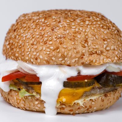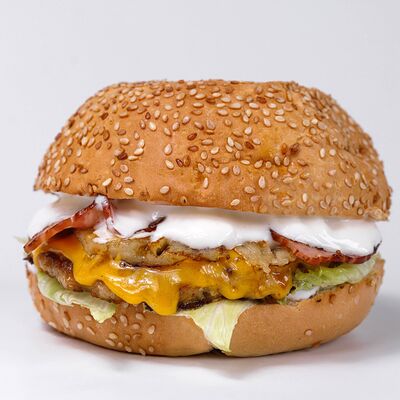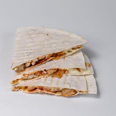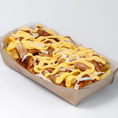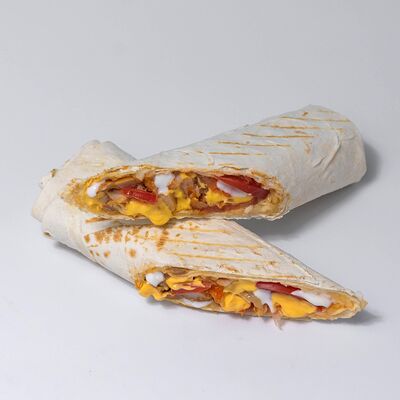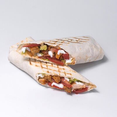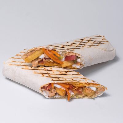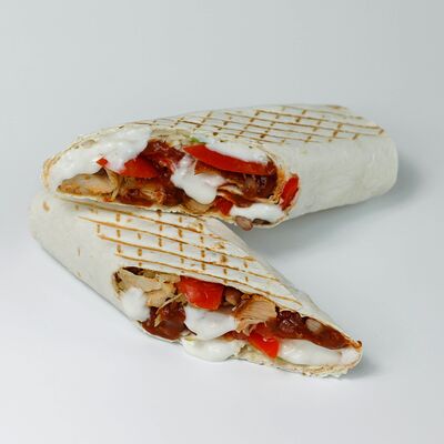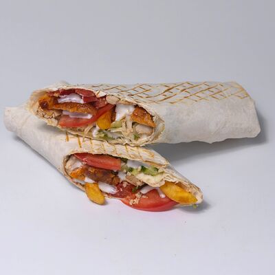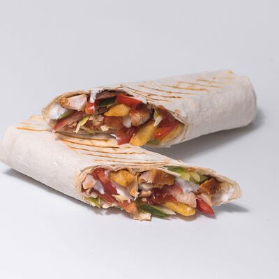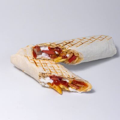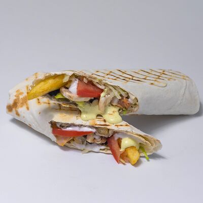 Лаваш, курица, помидоры, свежий огурец, лук маринованный, соус чесночный (двойная порция), картофель фри