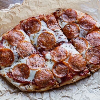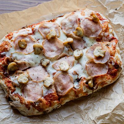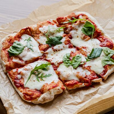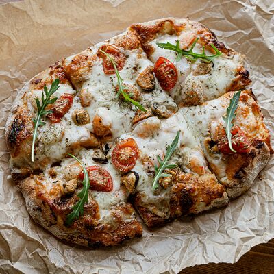 Хрустящее римское тесто (30х25 см), аргентинские креветки, филе мидий, сезонные томаты, фирменный соус на основе том ям пасты, сушеный лемонграсс