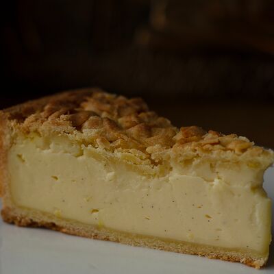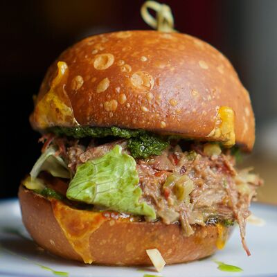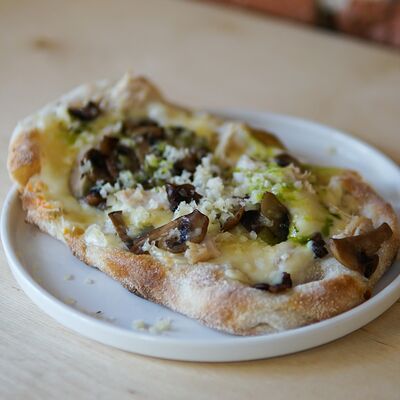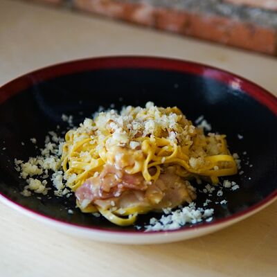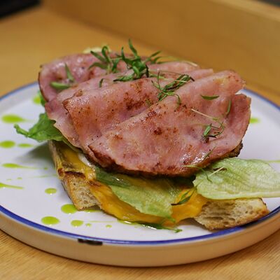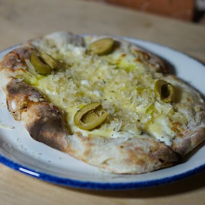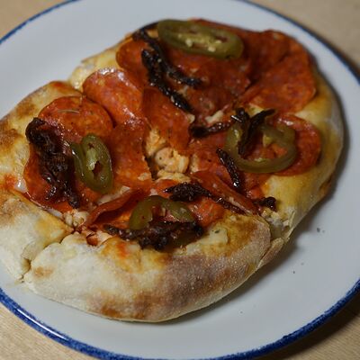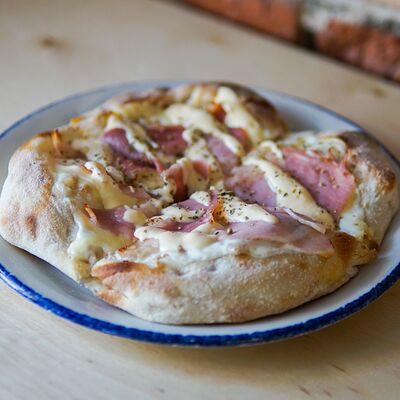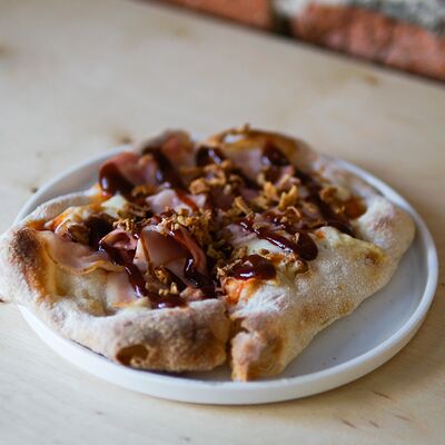 Парбейк (основа для римской пиццы), соус томатный, грудинка, сыр моцарелла. Украшение: лук жареный, соус BBQ, зеленое масло, сухие специи (майоран, базилик) (20 см)