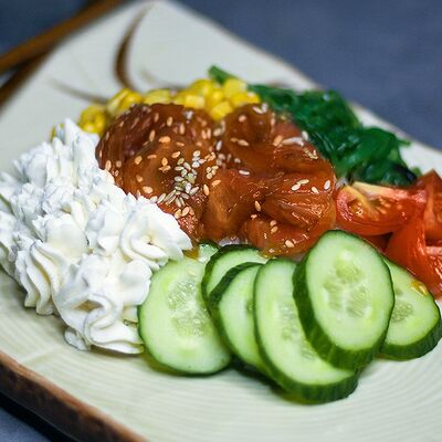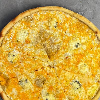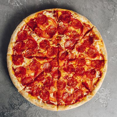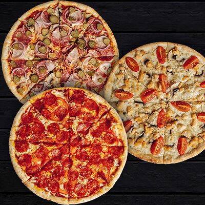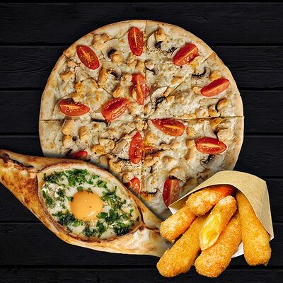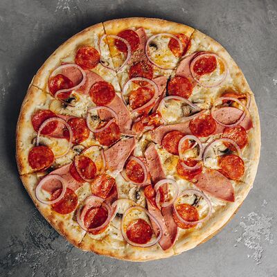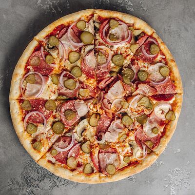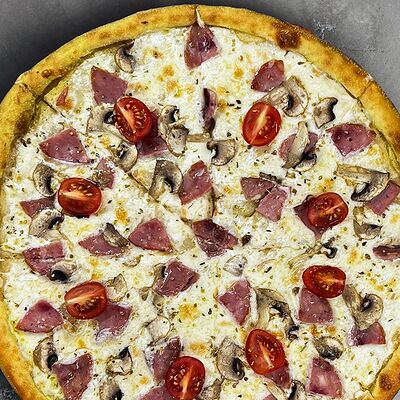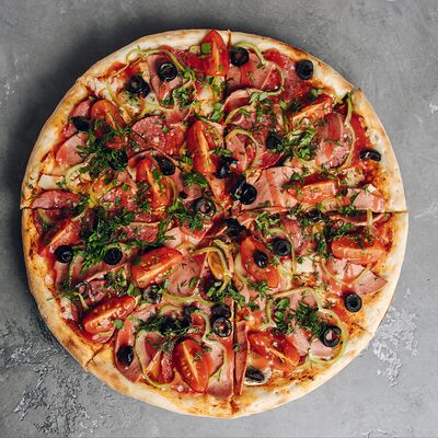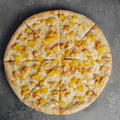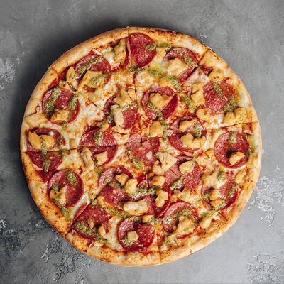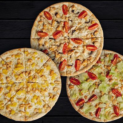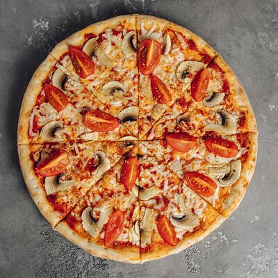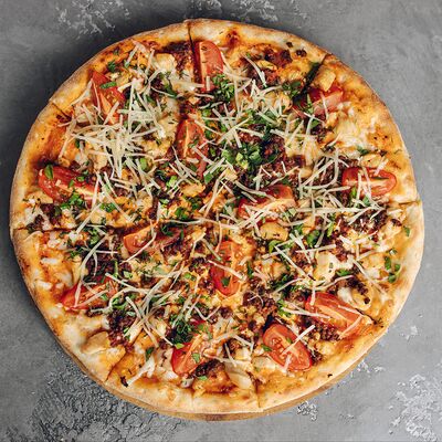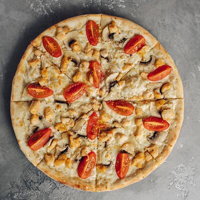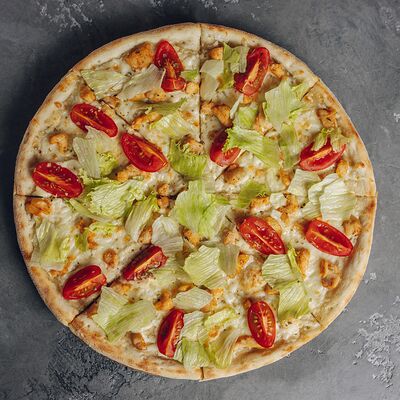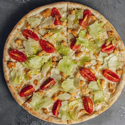 Черри, салат, помидор, курица маринованная, цезарь-соус, сыр голландский и сыр моцарелла, соус чесночный, сыр пармезан, тесто (30 см)