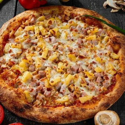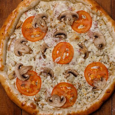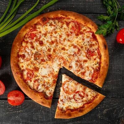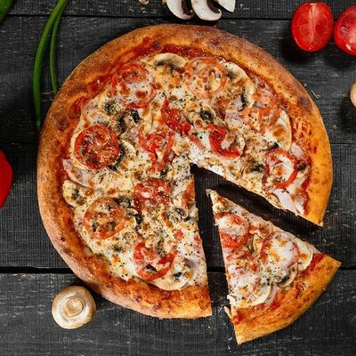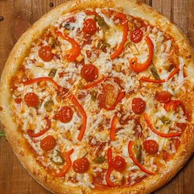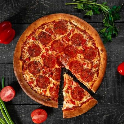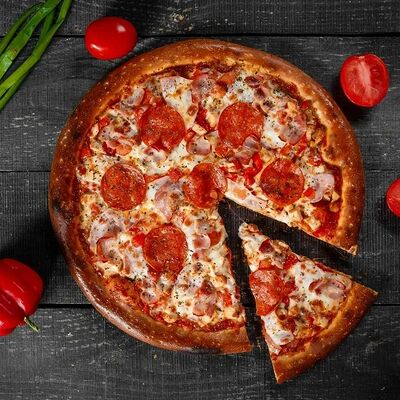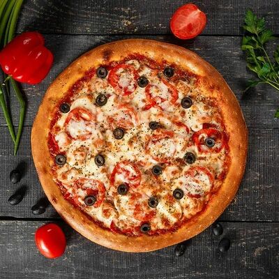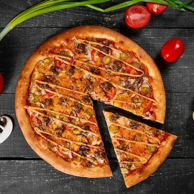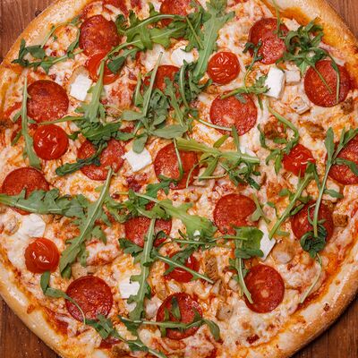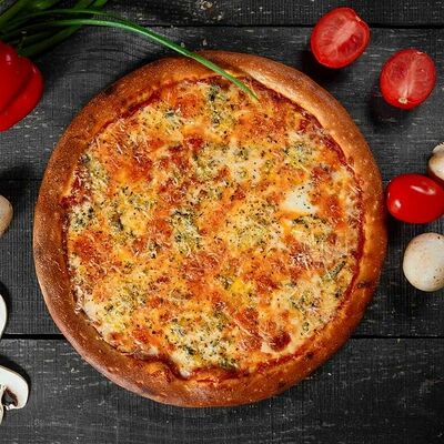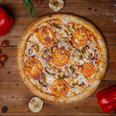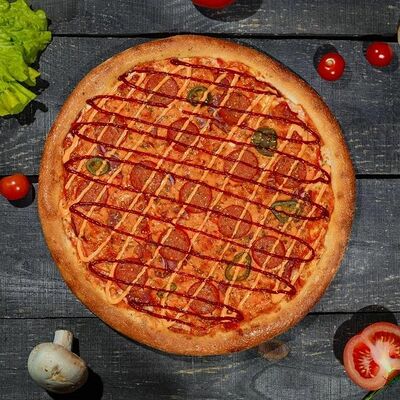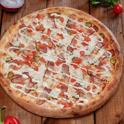 Фарш говяжий, моцарелла, чеддер, томаты, соус бургер, томатный соус, лук, маринованные огурчики (32 см)
