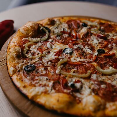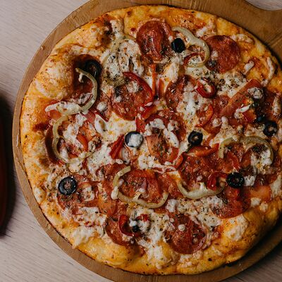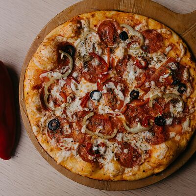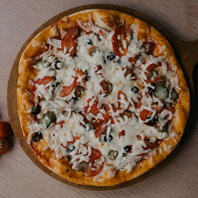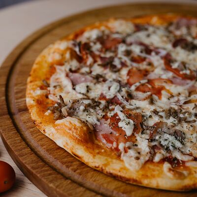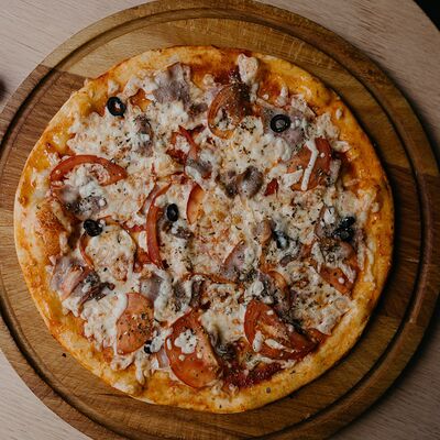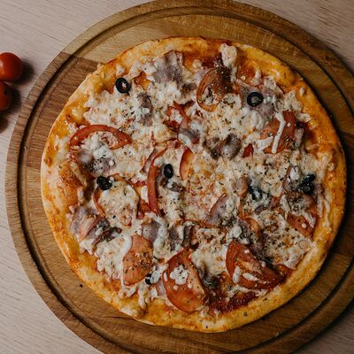 Неаполитанский соус, моцарелла, томаты, ветчина, салями, мясной фарш (говядина-свинина), окорок, лук (30 см)