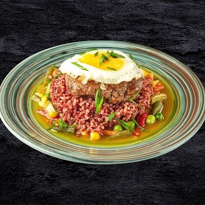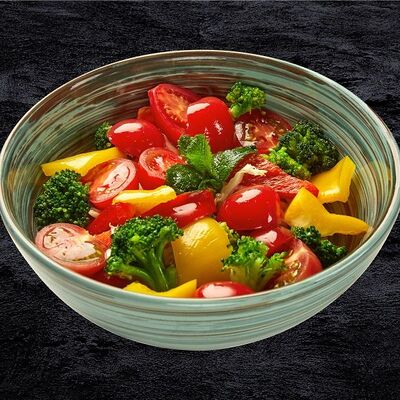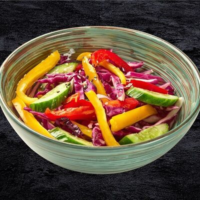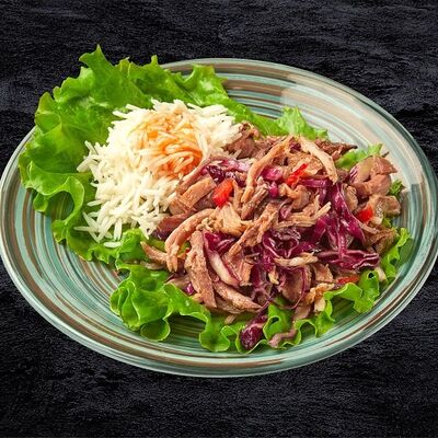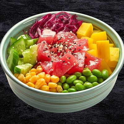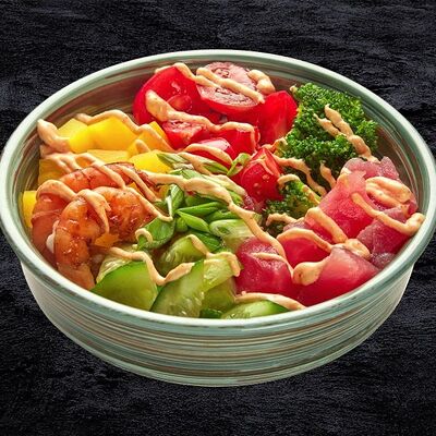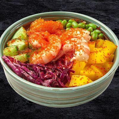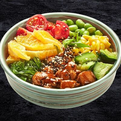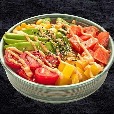 Рис, лосось, кокосовый чили соус, авокадо, черри, кукуруза, свежий огурец, дайкон, кунжут, зеленый лук, соус Спайси вейв