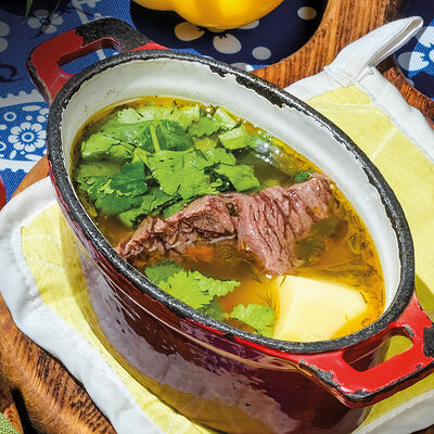 Мясной бульон, отварная говядина, картофель, репчатый лук, перец болгарский, паприка