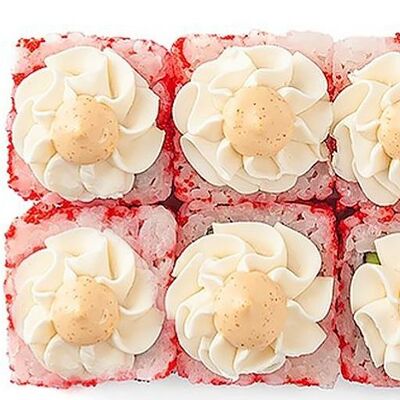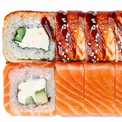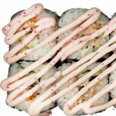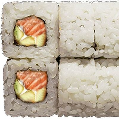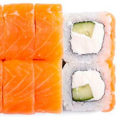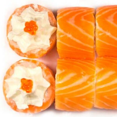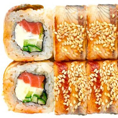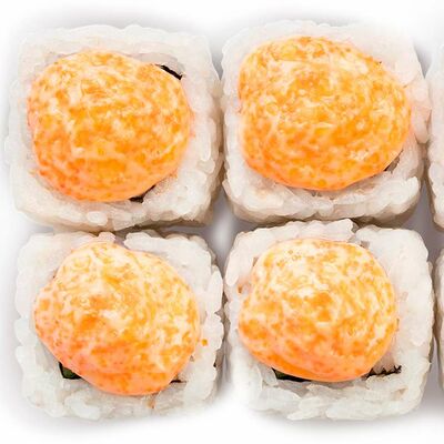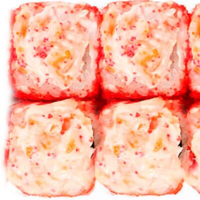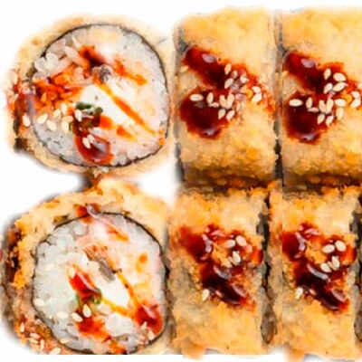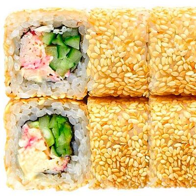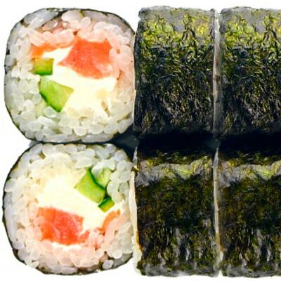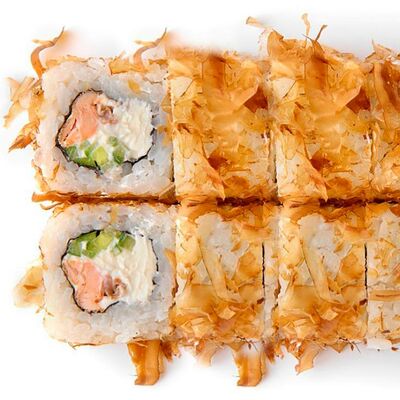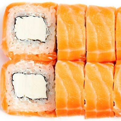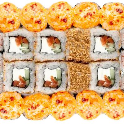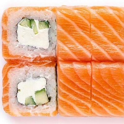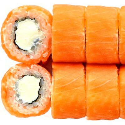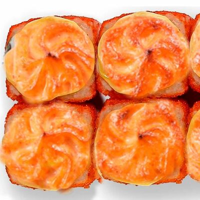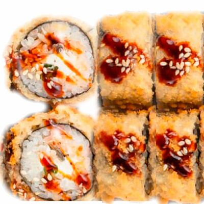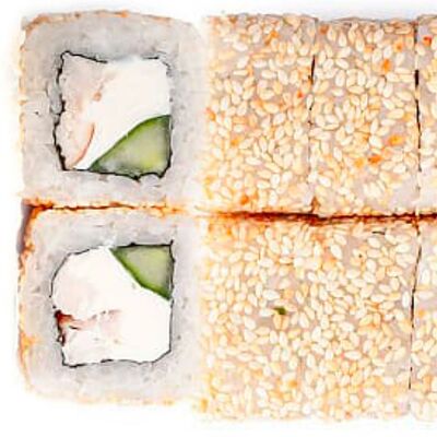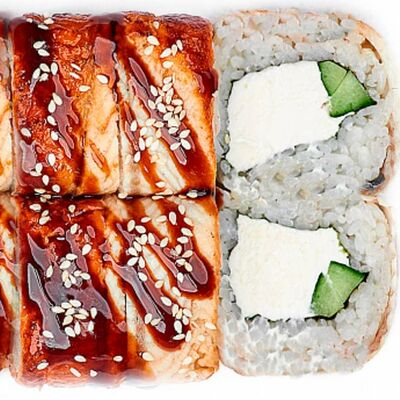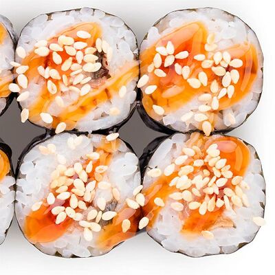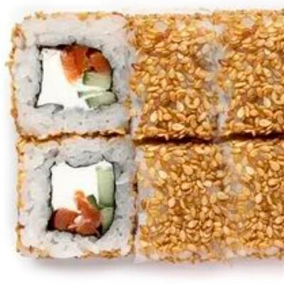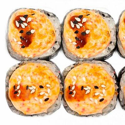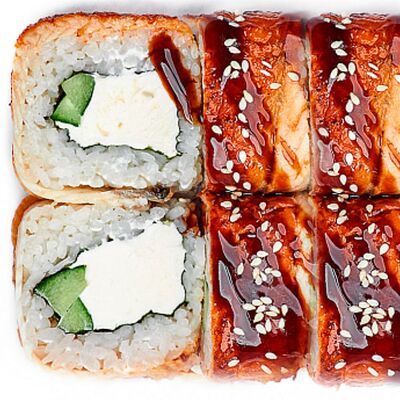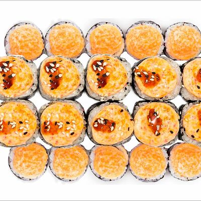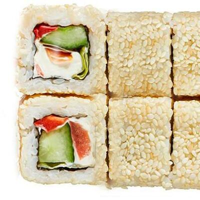Рис, нори, сыр сливочный, лосось, огурец, шапка: чикен, унаги соус, кунжут 10 шт