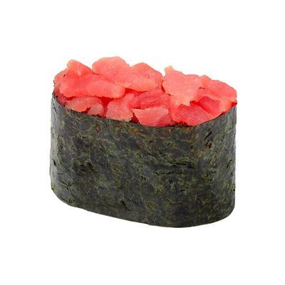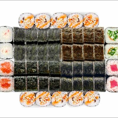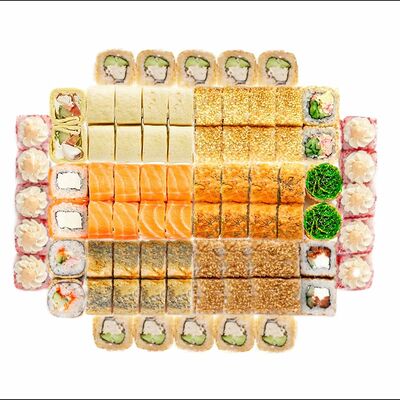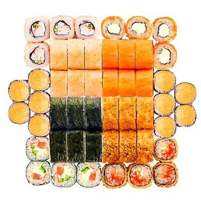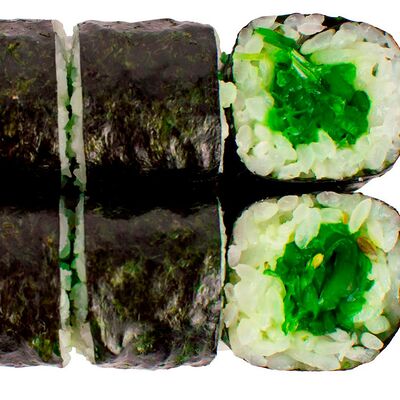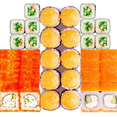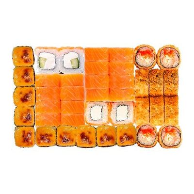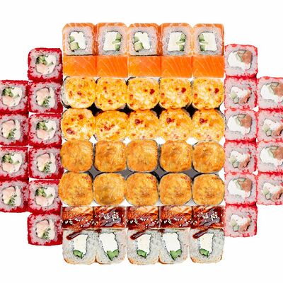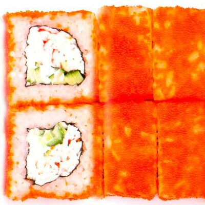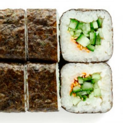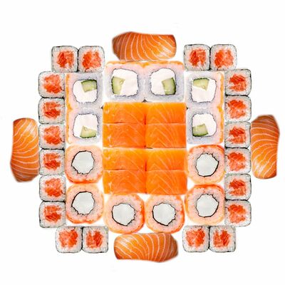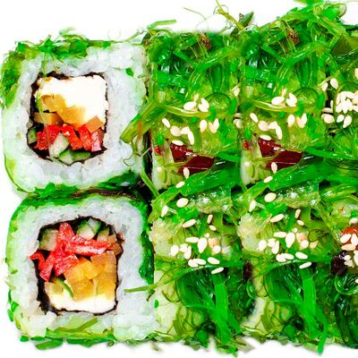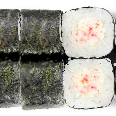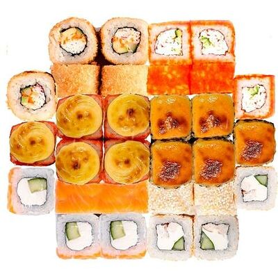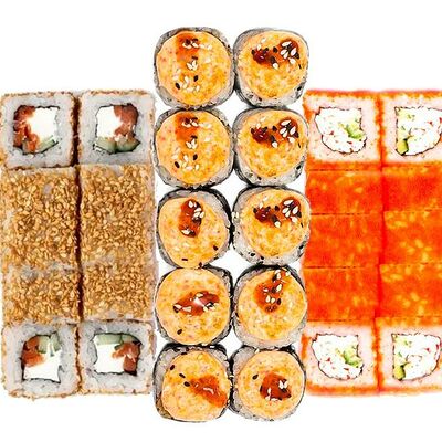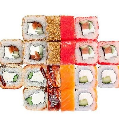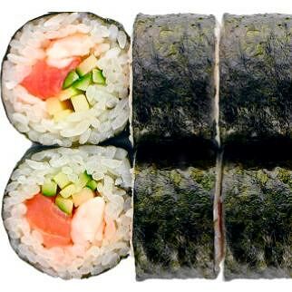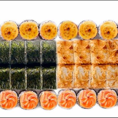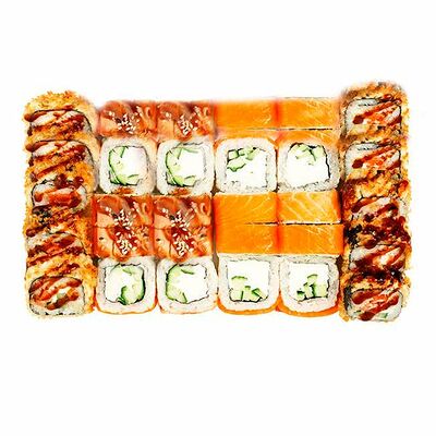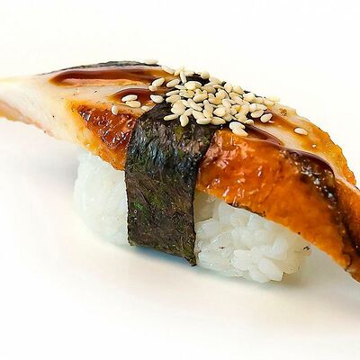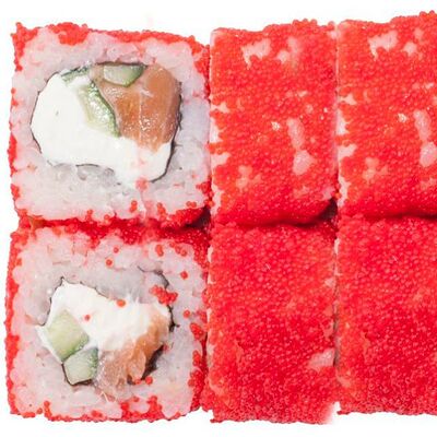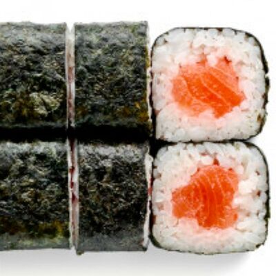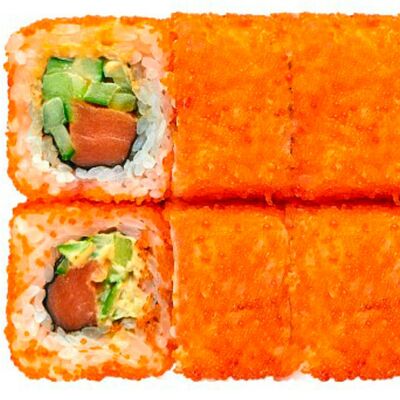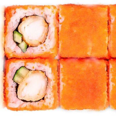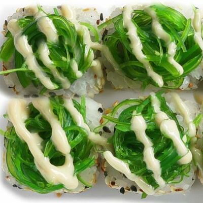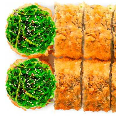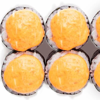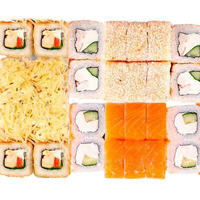 Рис, нори, сыр сливочный, лосось, огурец, шапка: чикен, унаги соус, кунжут 10 шт