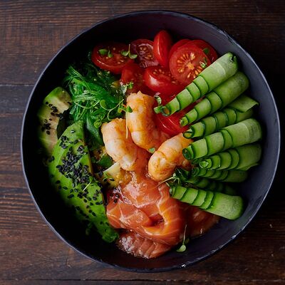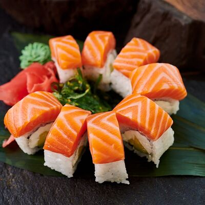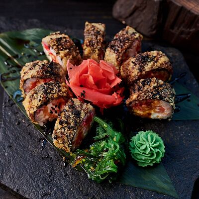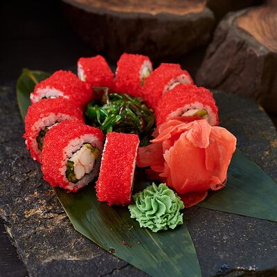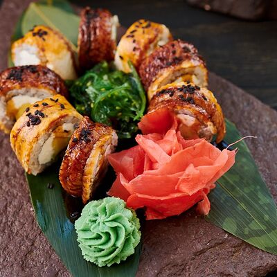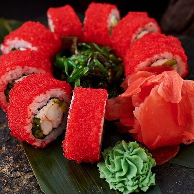 Рис, соевый соус, васаби, имбирь маринованный, чука, нори, креметте, лосось, креветка, тобико, яйцо, мука пшеничная, сухари панко, унаги