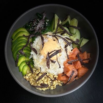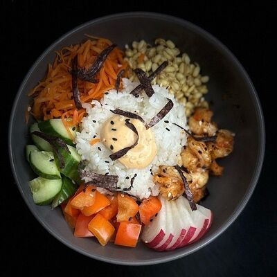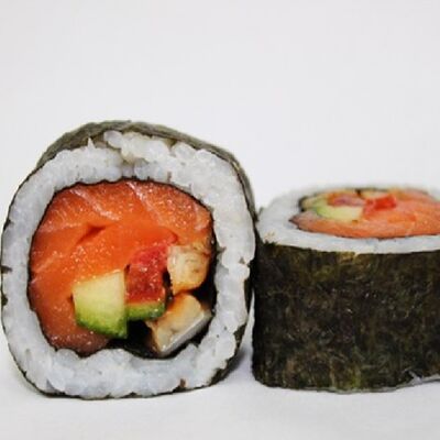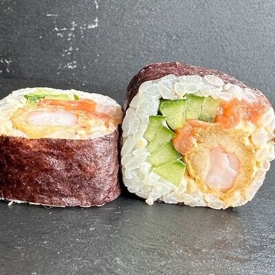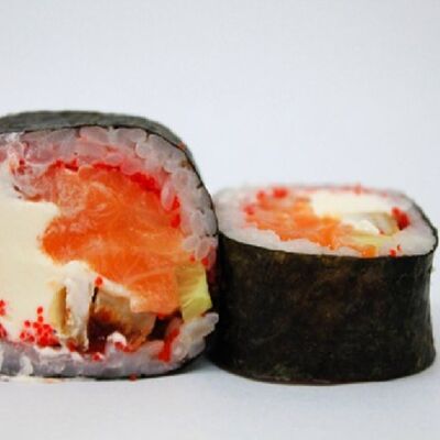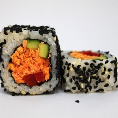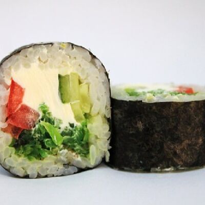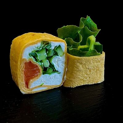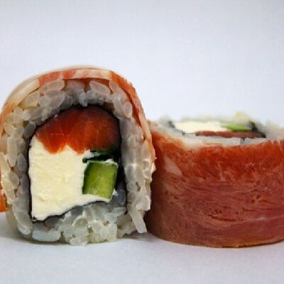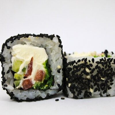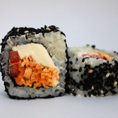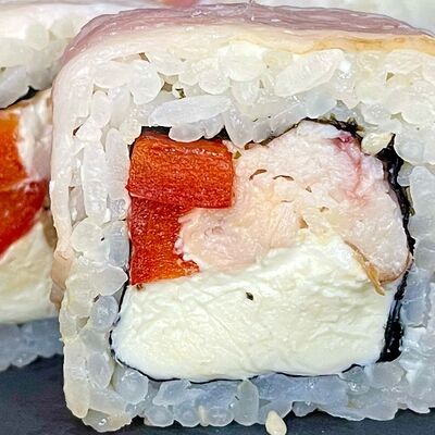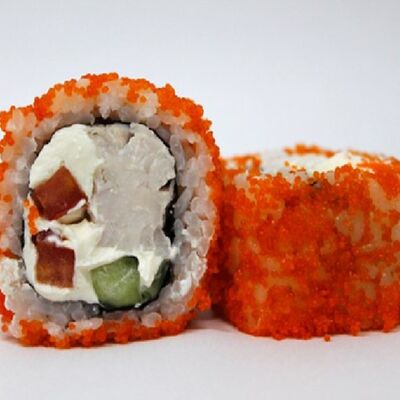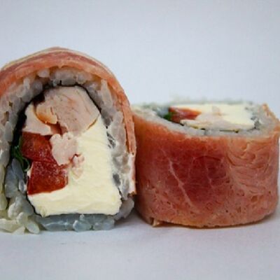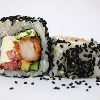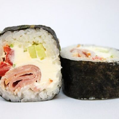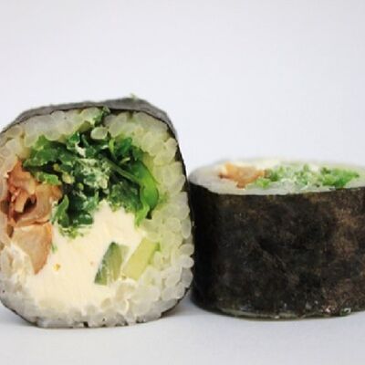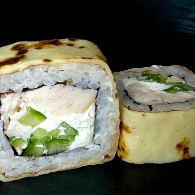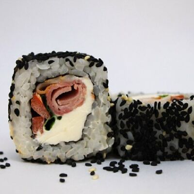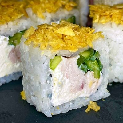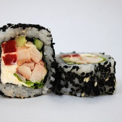 Рис, сливочный сыр, копченная грудка, соус Цезарь, болгарский перец, лист салата, кунжут микс (8 шт.)