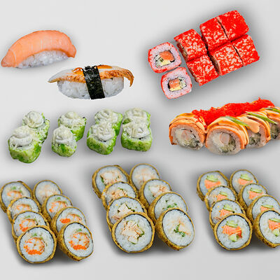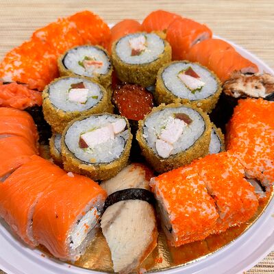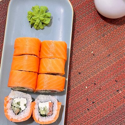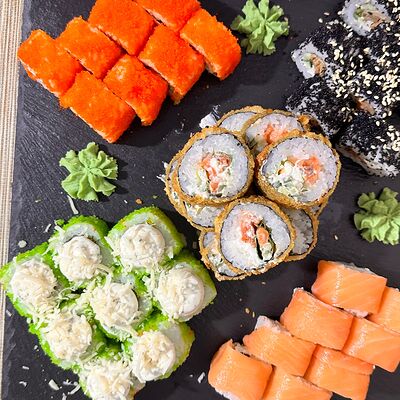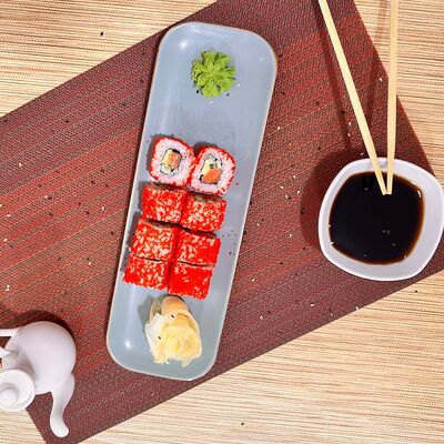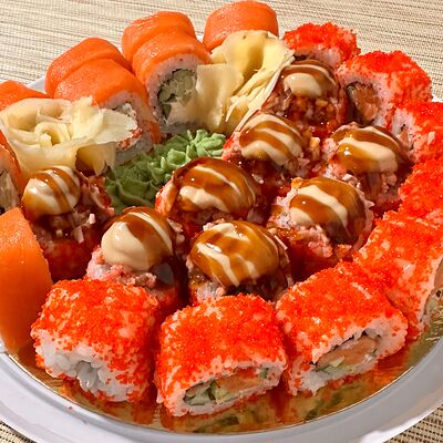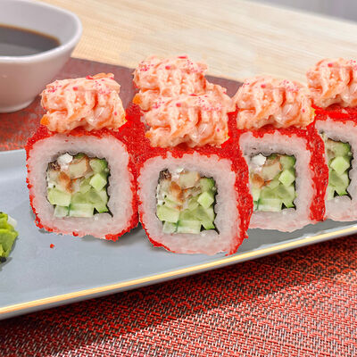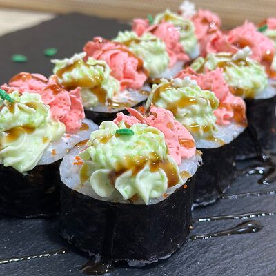 Рис, нори, сыр творожный, масаго, угорь, огурцы, замес зеленый, замес розовый, соусы: спайси, унаги