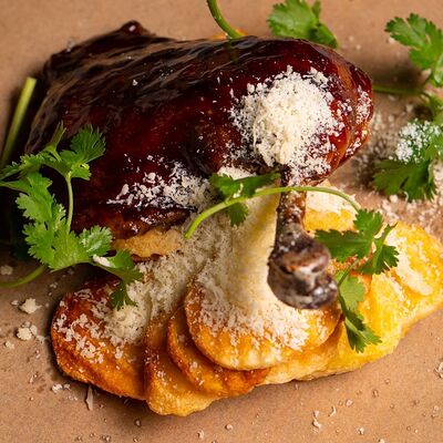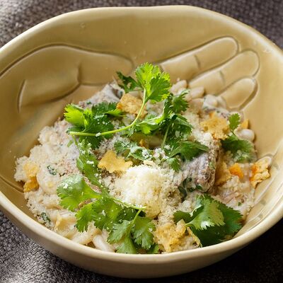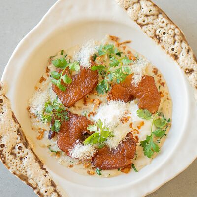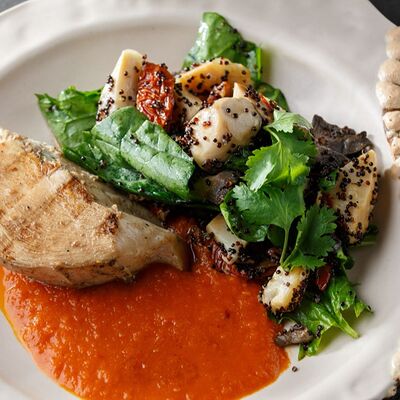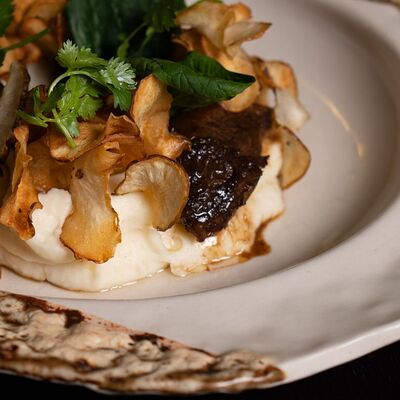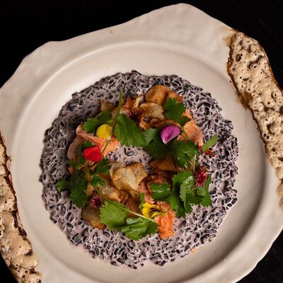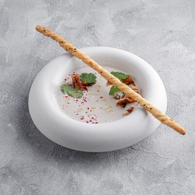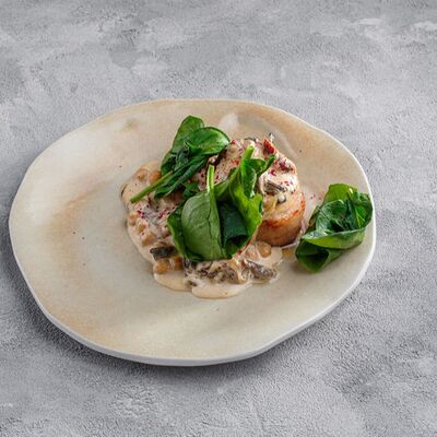 Шампиньоны, сливки, лук, подкопчённые вешенки, трюфельное масло, гриссини
