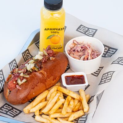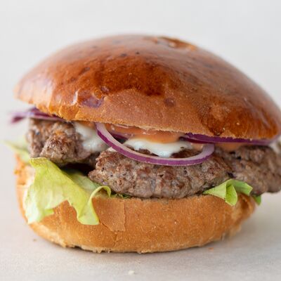 Булочка бриошь, соус гриль, соус острая сальса, соус демиглас сырный, томленая говядина, лук фиолетовый, руккола, лук карамелизованный с черникой, сыр чеддер