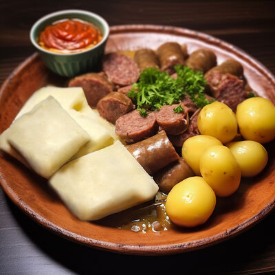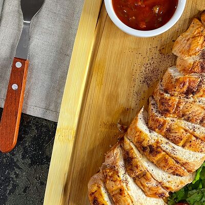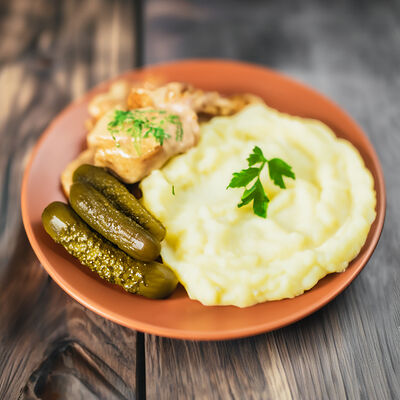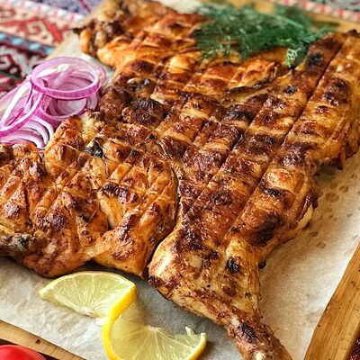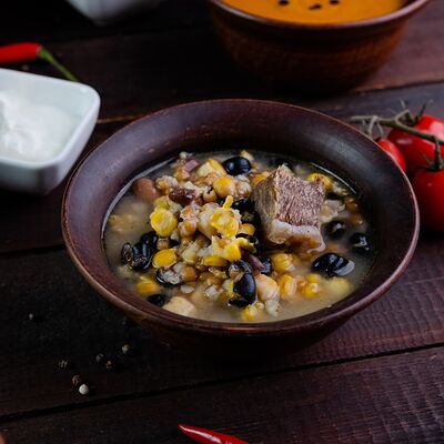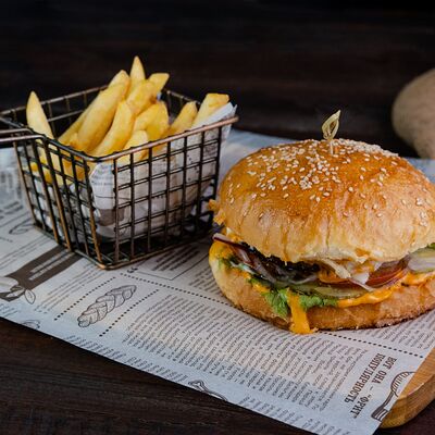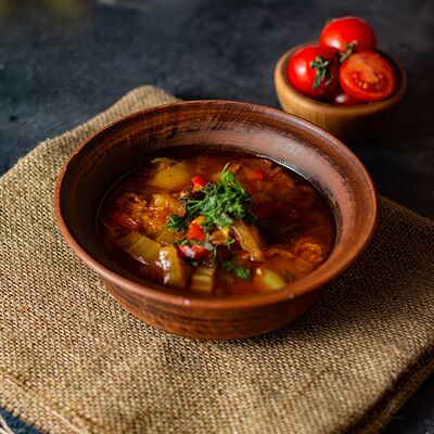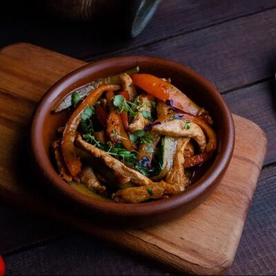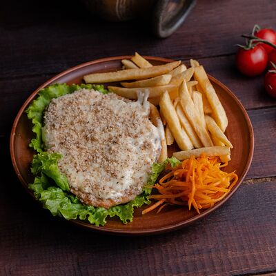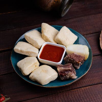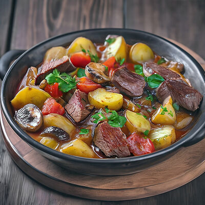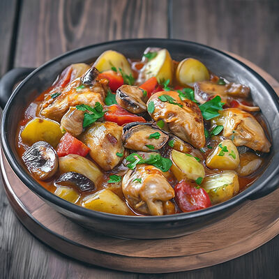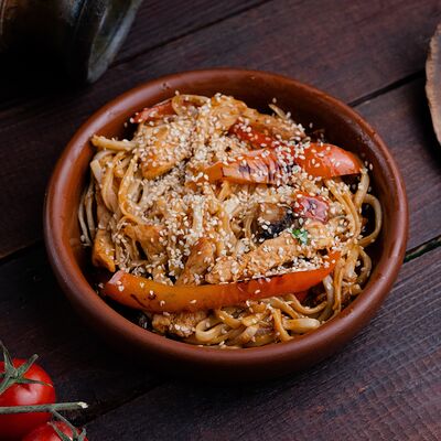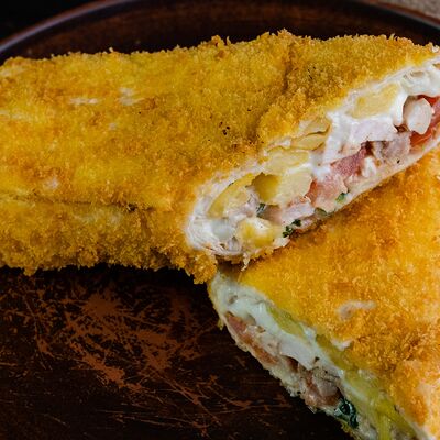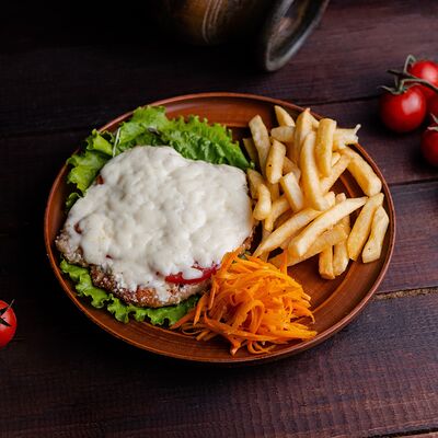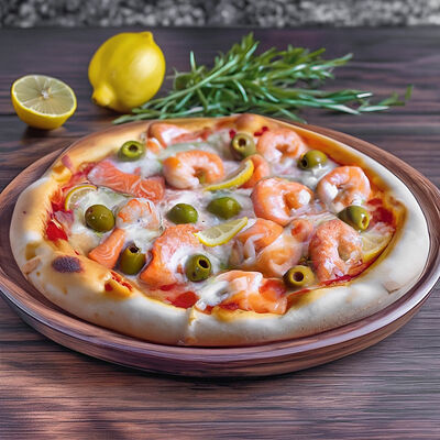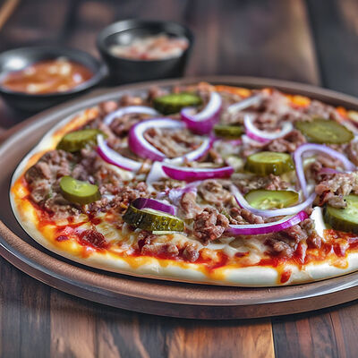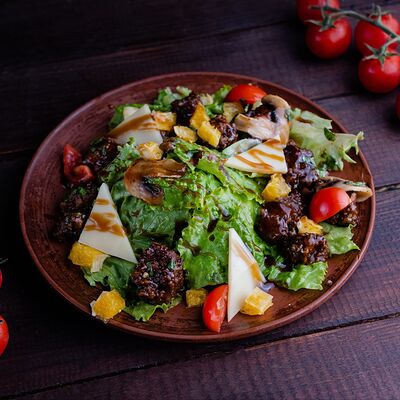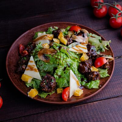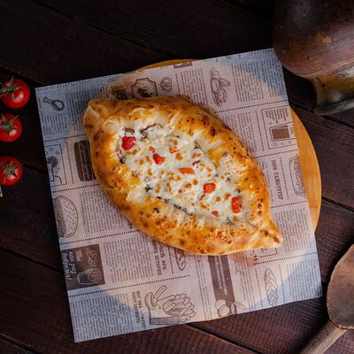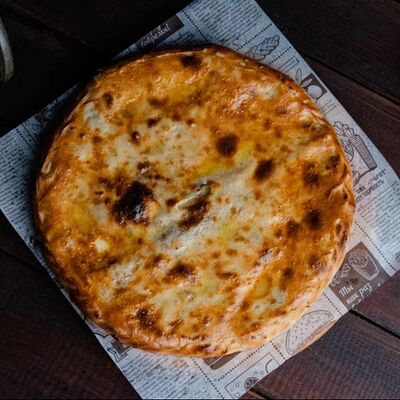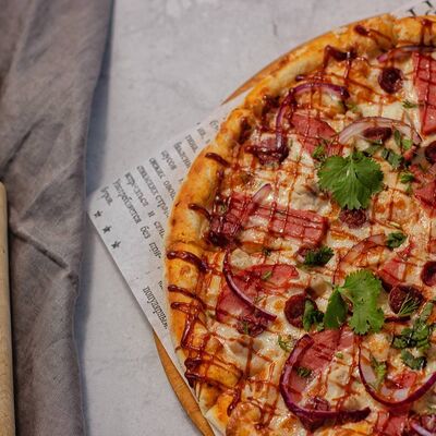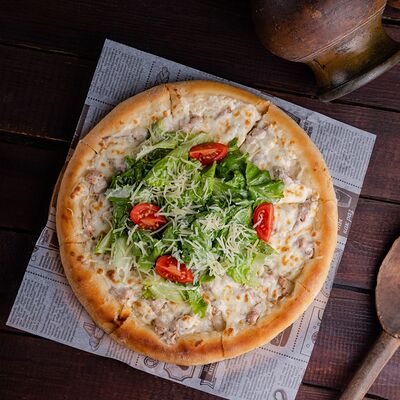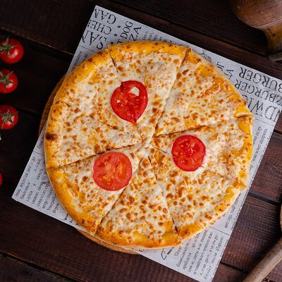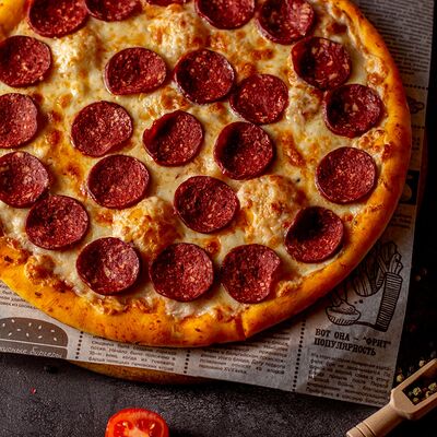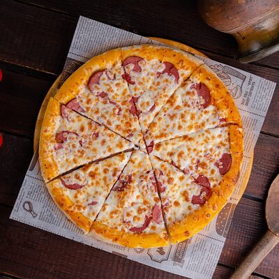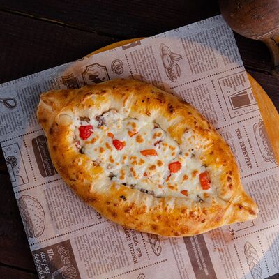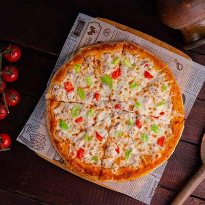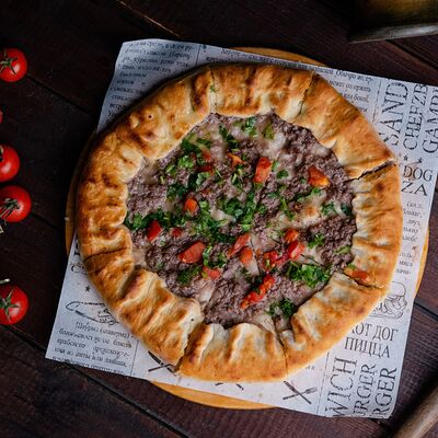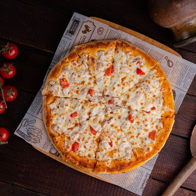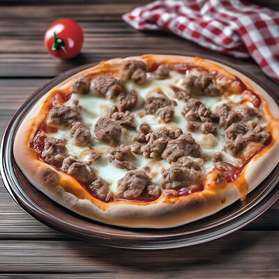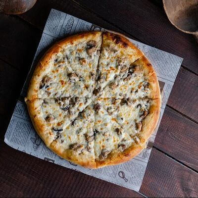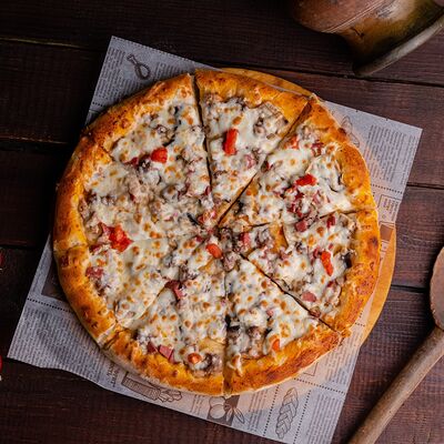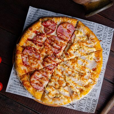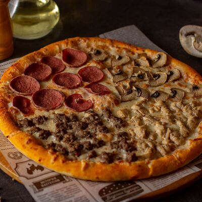 Говяжий фарш, куриное филе, колбаса, грибы, сыр моцарелла, помидор, соус на пиццу