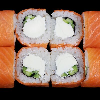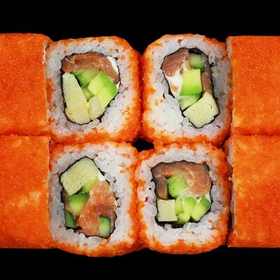 Рис, нори, майонез, огурец, авокадо, масаго, японский омлет (яйцо, сахар, соус соевый, хондаши), краб