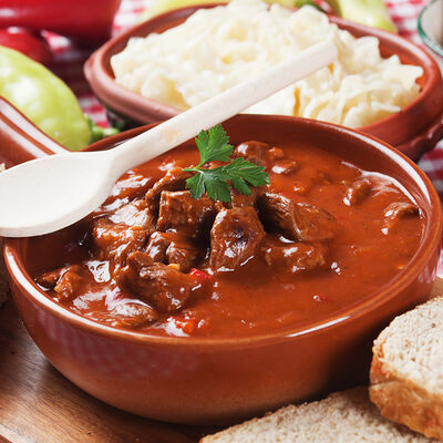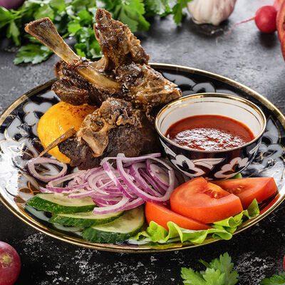 Бульон из говядины, говядина, лук репчатый, рис, томатная паста, морковь, чеснок свежий, хмели-сунели, петрушка сушеная, перец красный, перец черный горошек, лавровый лист, кориандр