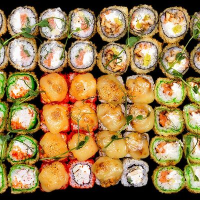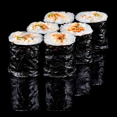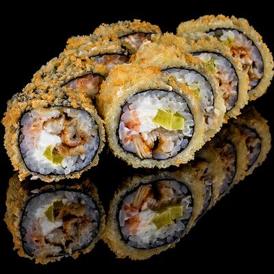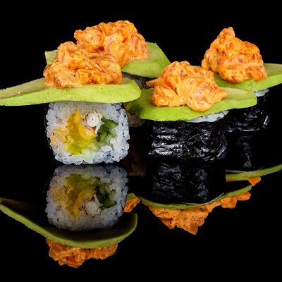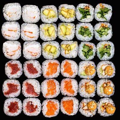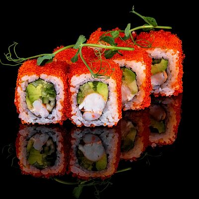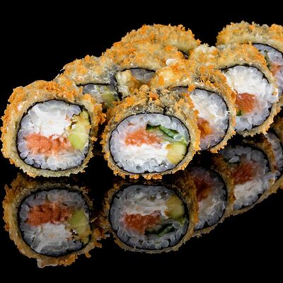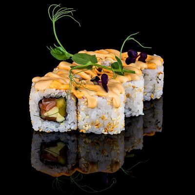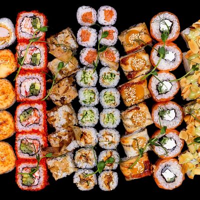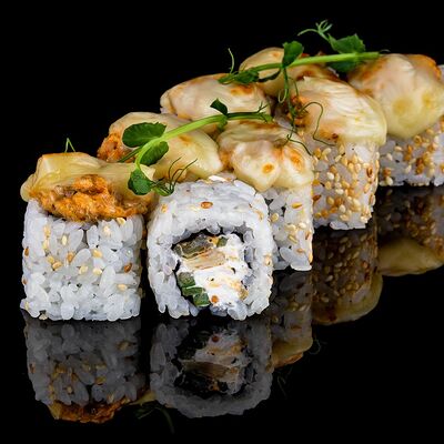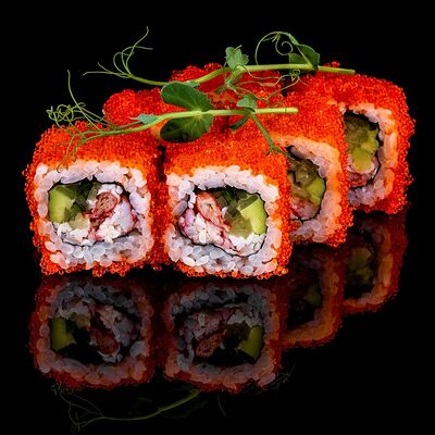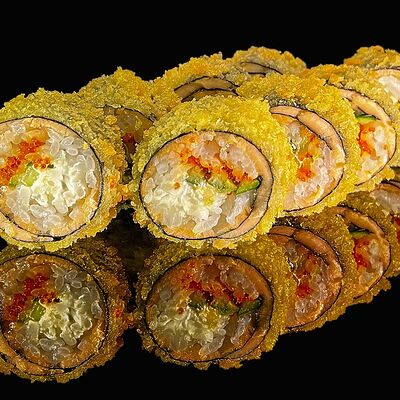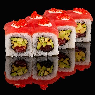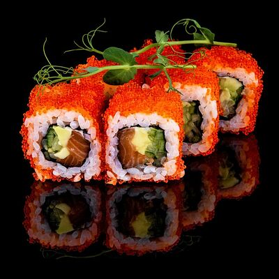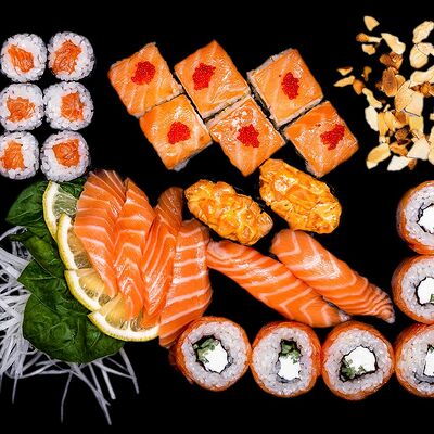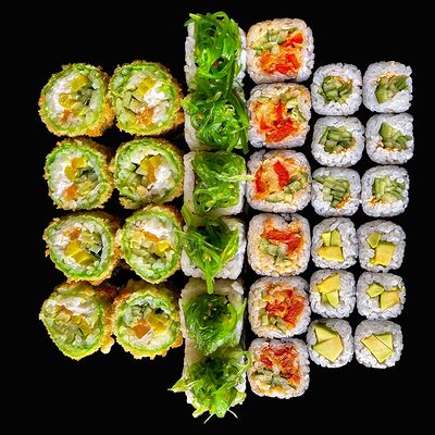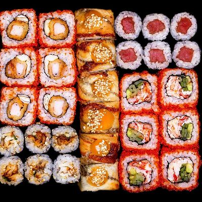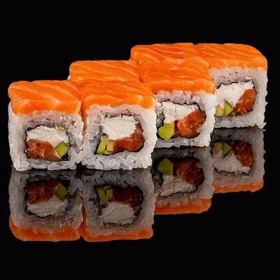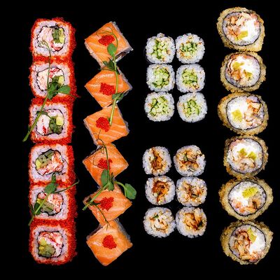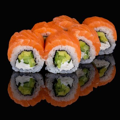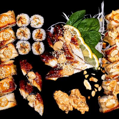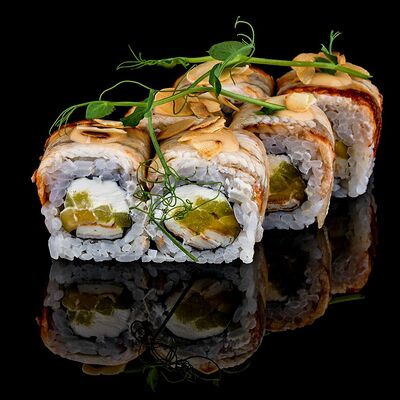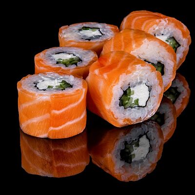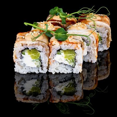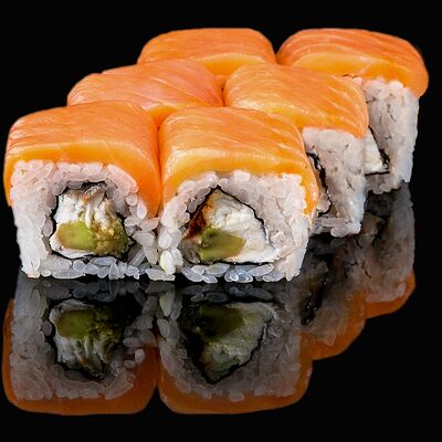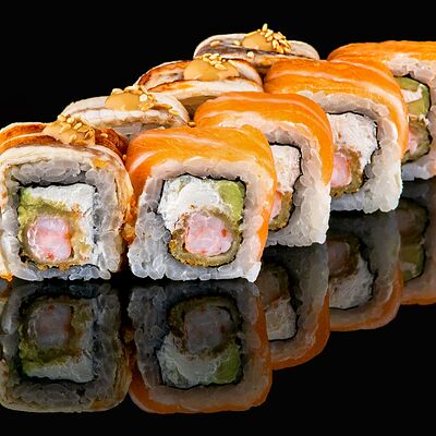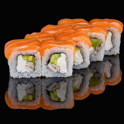 Рис, нори, сливочный сыр, авокадо, угорь, подкопченный лосось