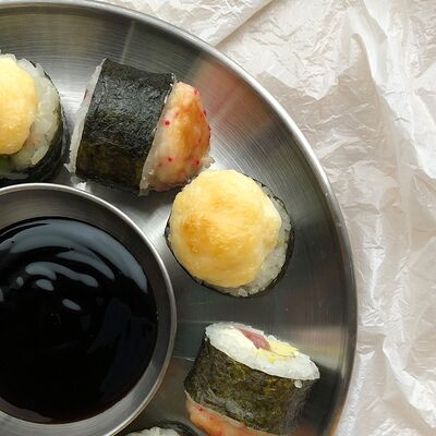 Рис, нори, сыр, тунец желтоперый, тобико, кунжут жареный