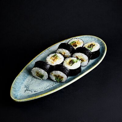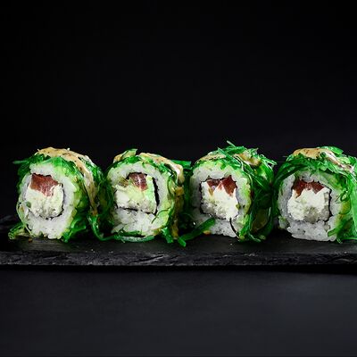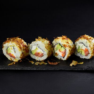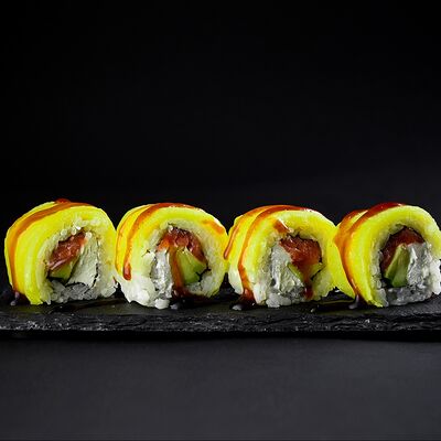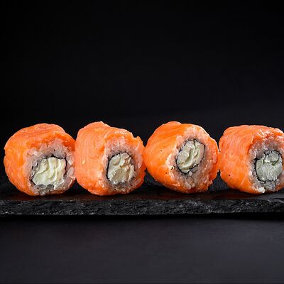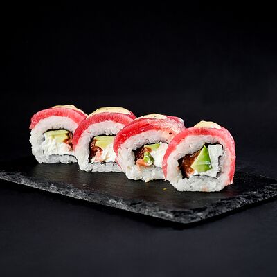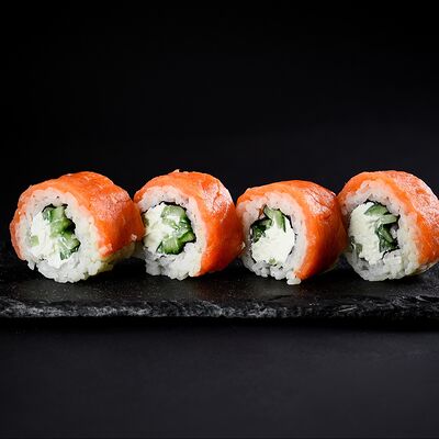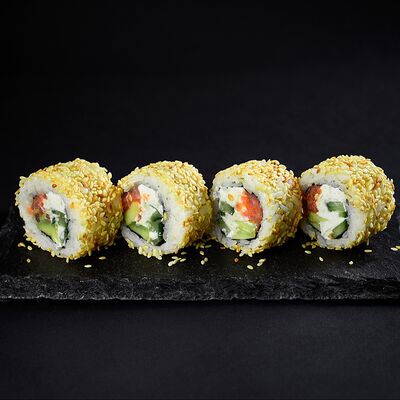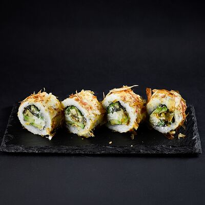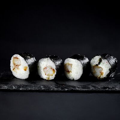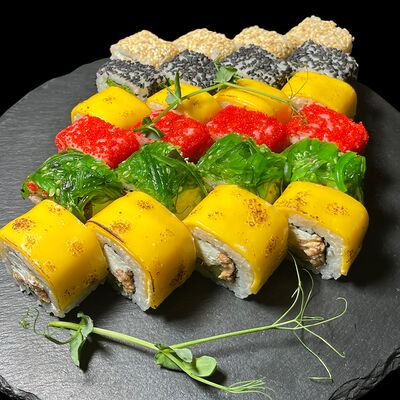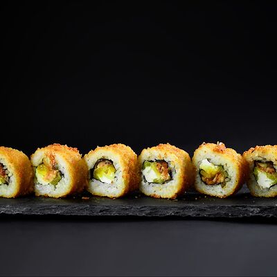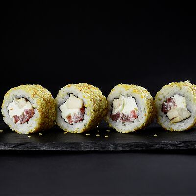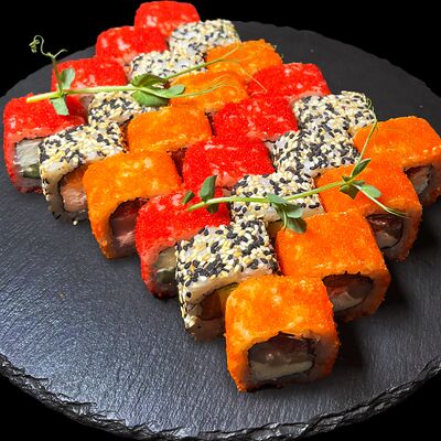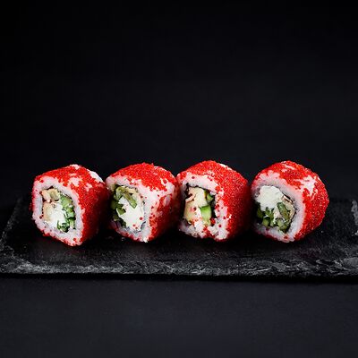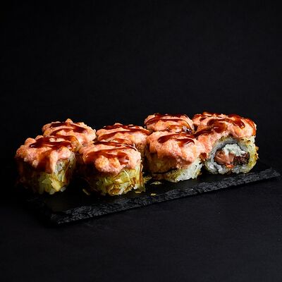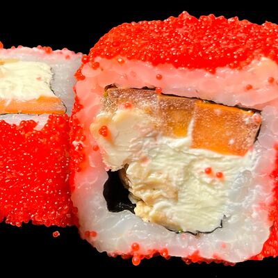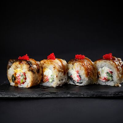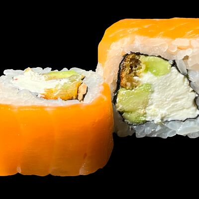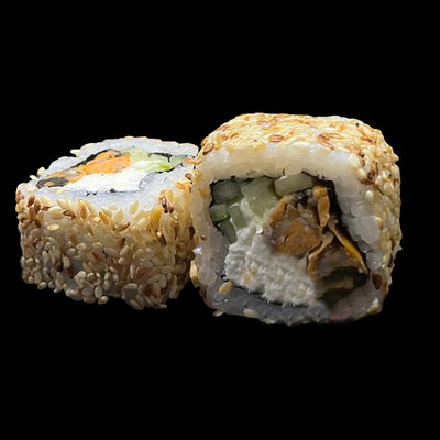 Рис, нори, сыр, огурец, угорь, кунжут, соус унаги. Соевый соус, имбирь и васаби в комплект не входят (8 шт.)