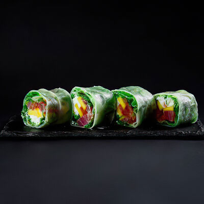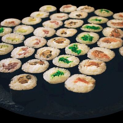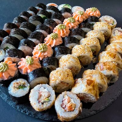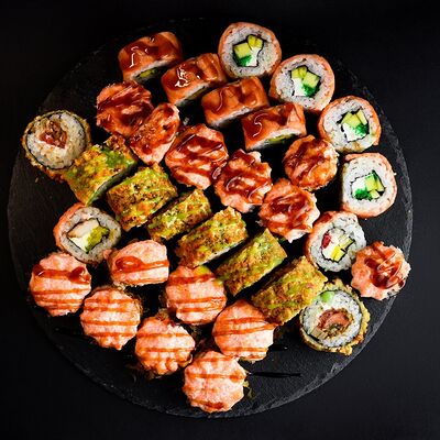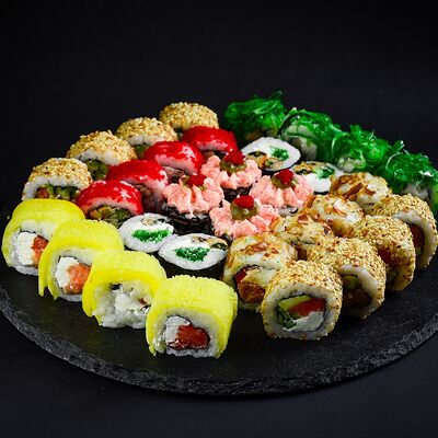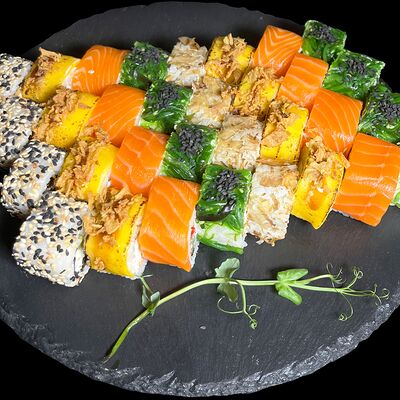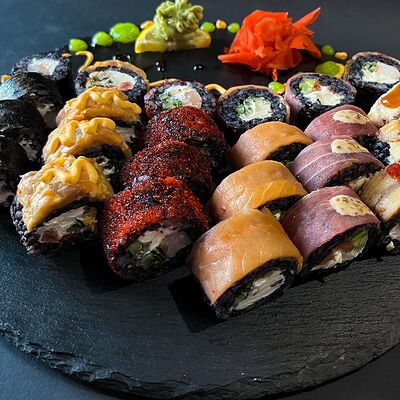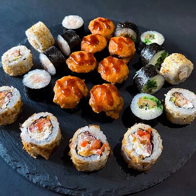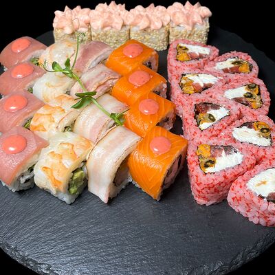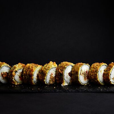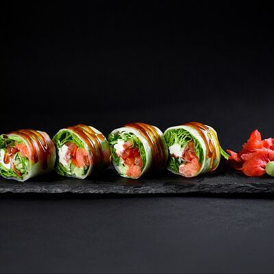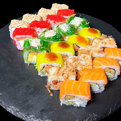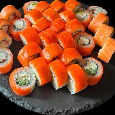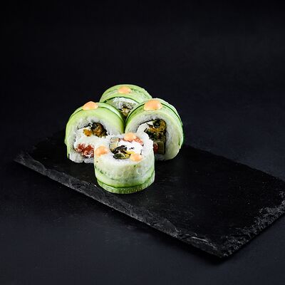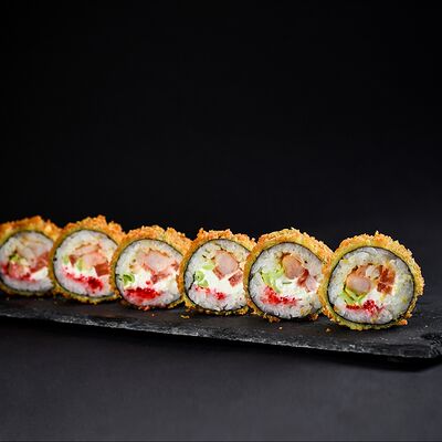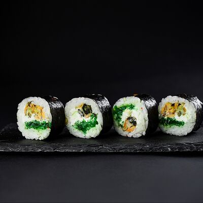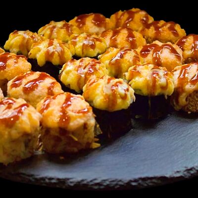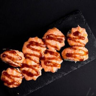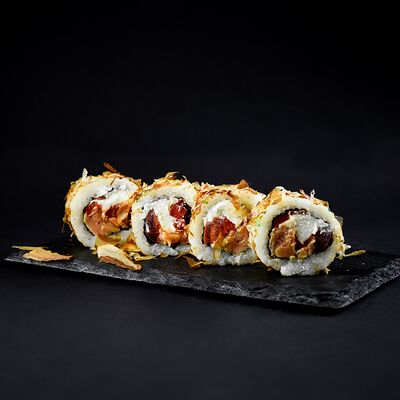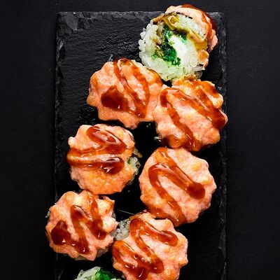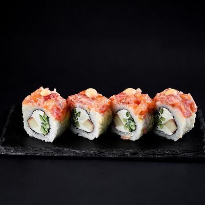 Рис, нори, сыр, огурец, угорь, кунжут, соус унаги. Соевый соус, имбирь и васаби в комплект не входят (8 шт.)