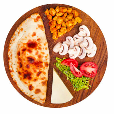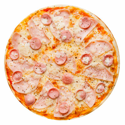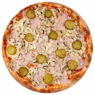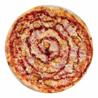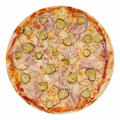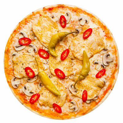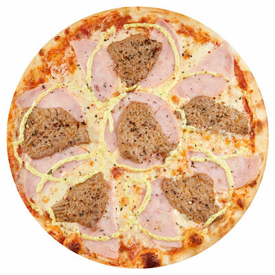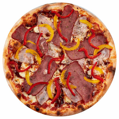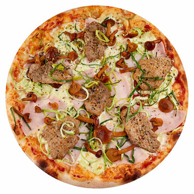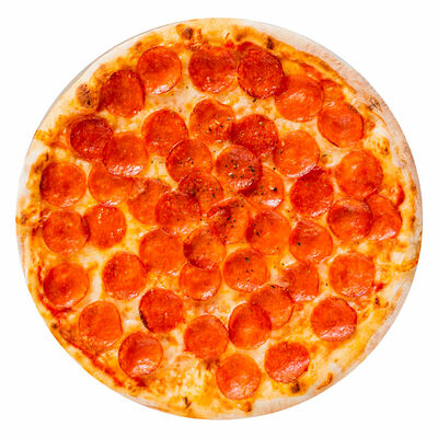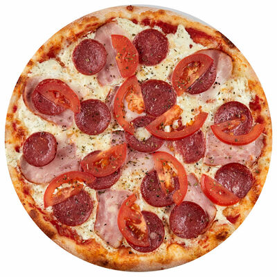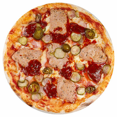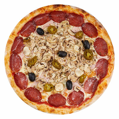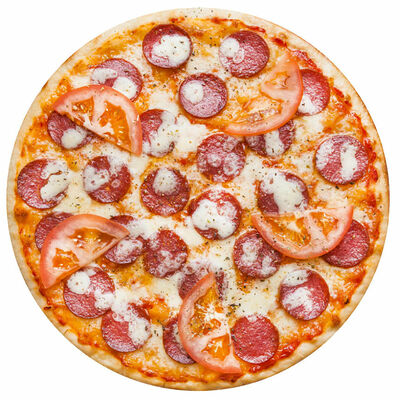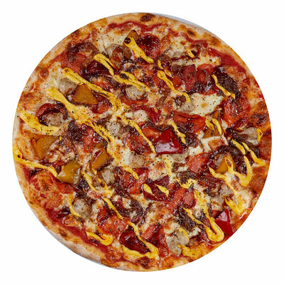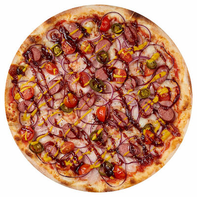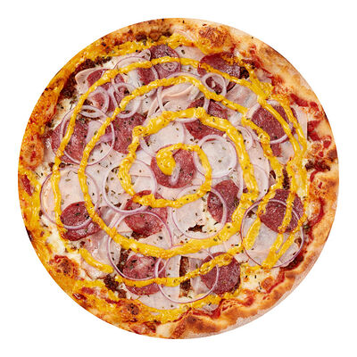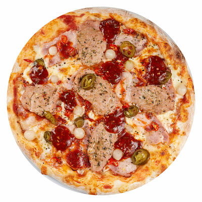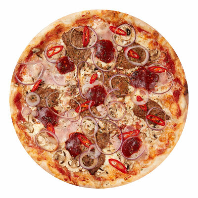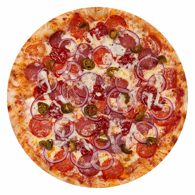 Соус из протёртых томатов, Моцарелла, салями, колбаса Пепперони, имбирный соус, красный лук, Халапеньо, приправа к пицце, чесночное масло