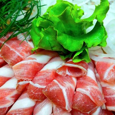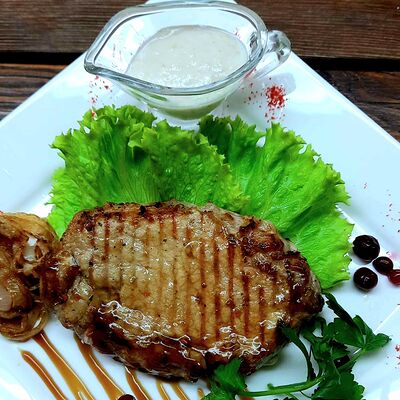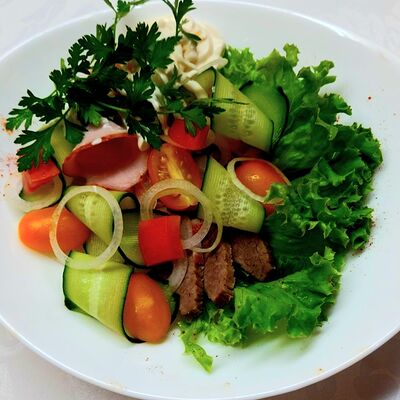 Кусочки сырой говядины, салат зелёный, чесночный соус, сыр, лимон зелень