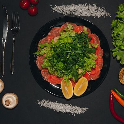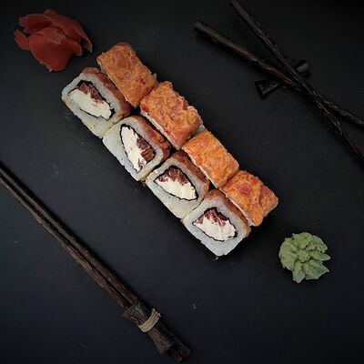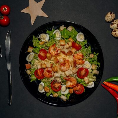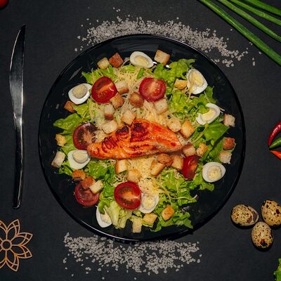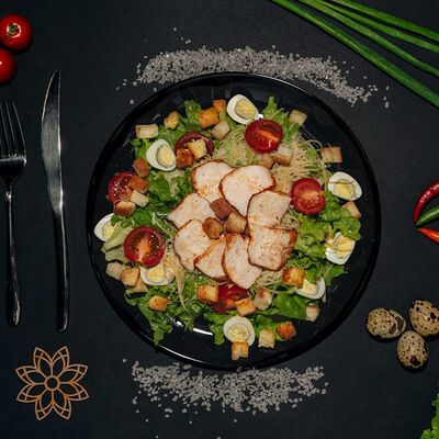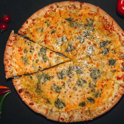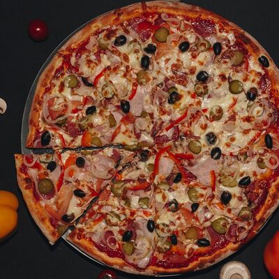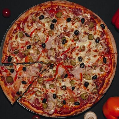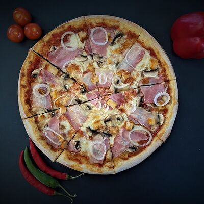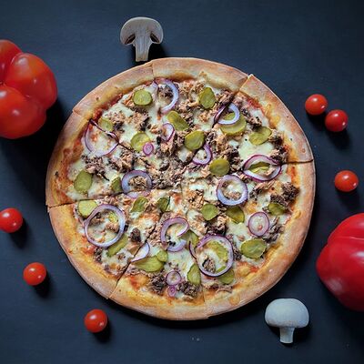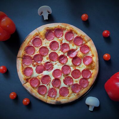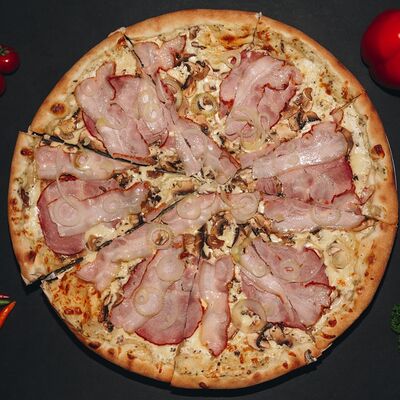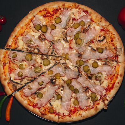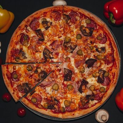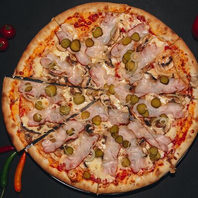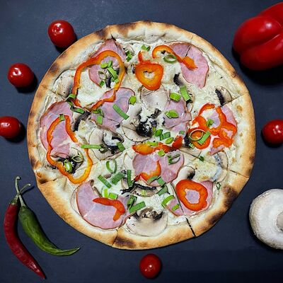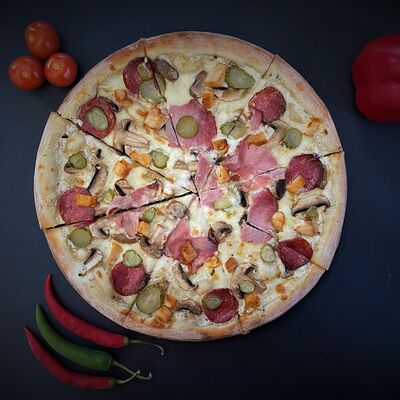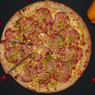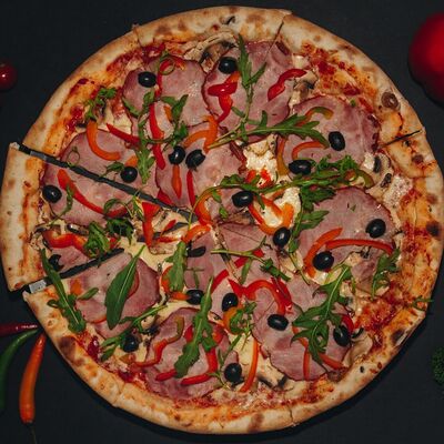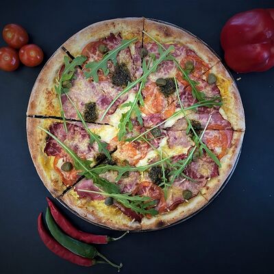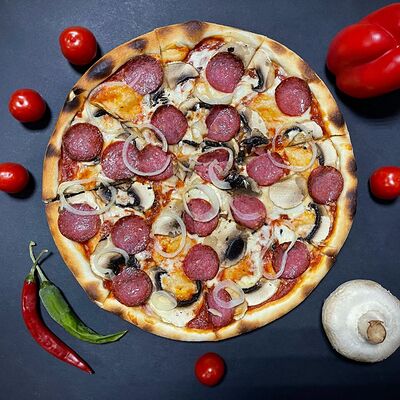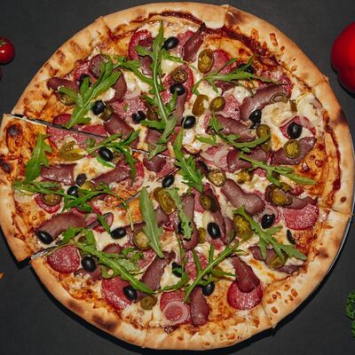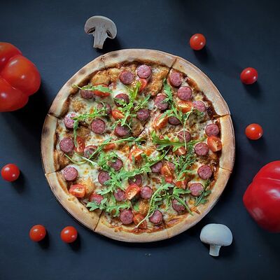 Тесто, соус барбекю, сыр Моцарелла, охотничьи колбаски, томат черри, руккола (40 см)
