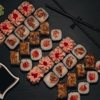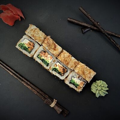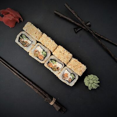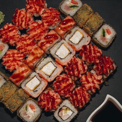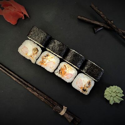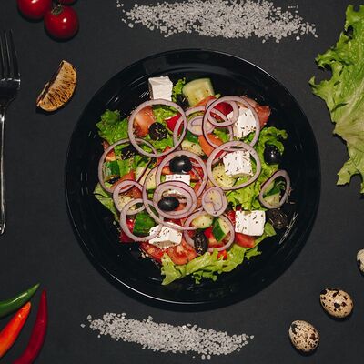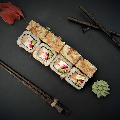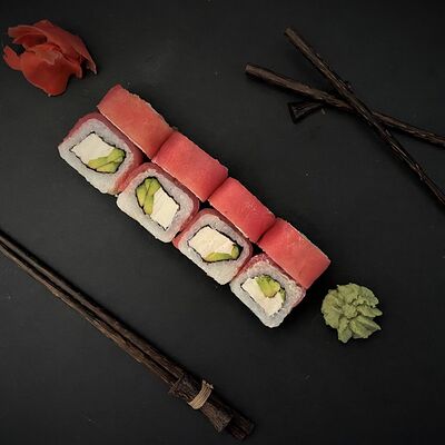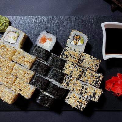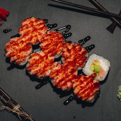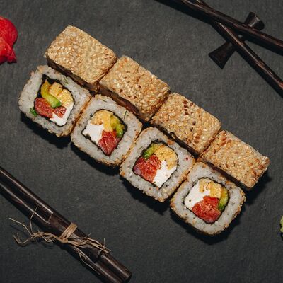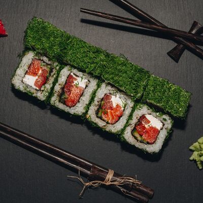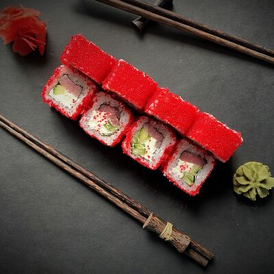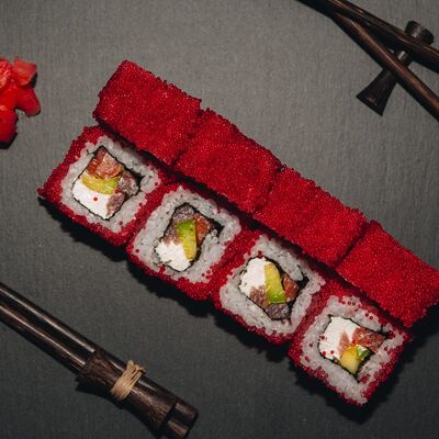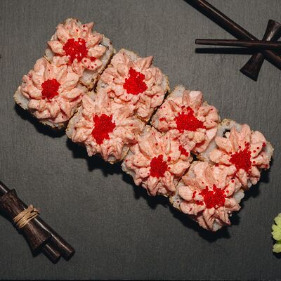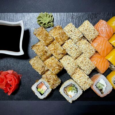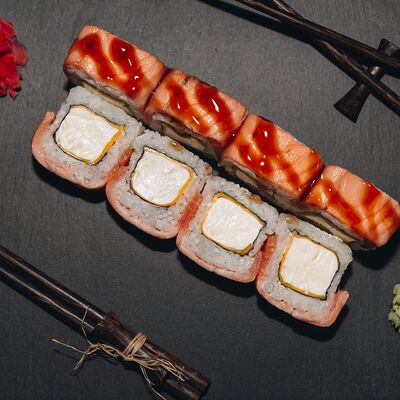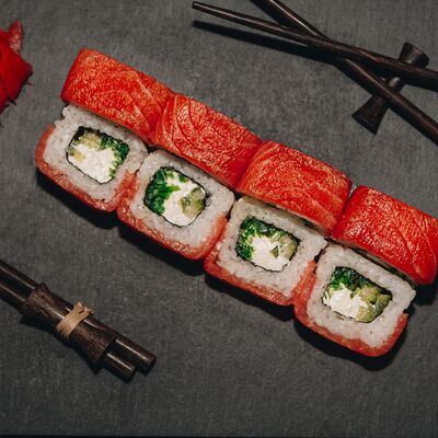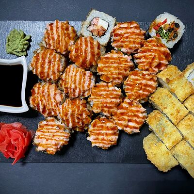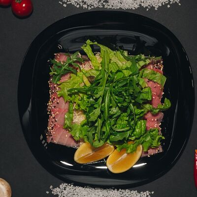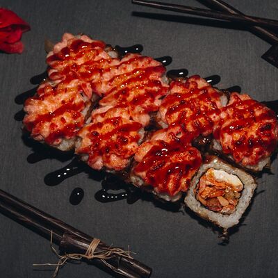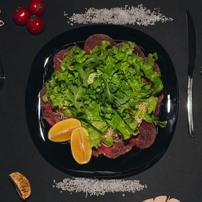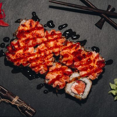 Тесто, соус барбекю, сыр Моцарелла, охотничьи колбаски, томат черри, руккола (40 см)