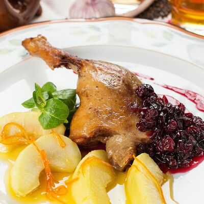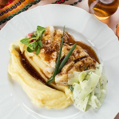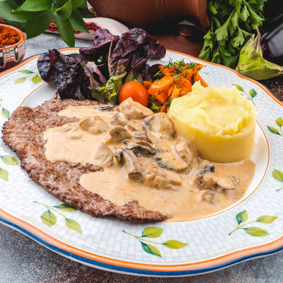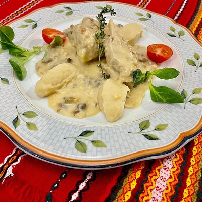 Ножка кролика, тушеная в сливочно-винном соусе с шампиньонами и белыми грибами. Подается с пюре из сельдерея
