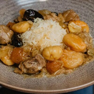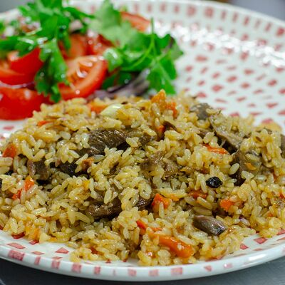 Плов с мясом барана, с добавлением сухофруктов и лука