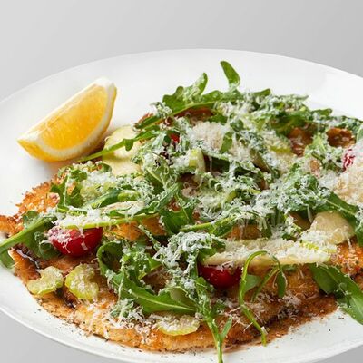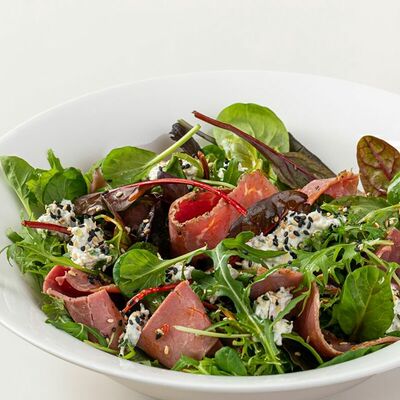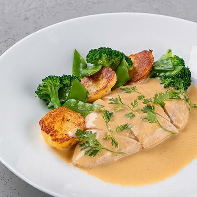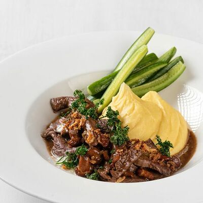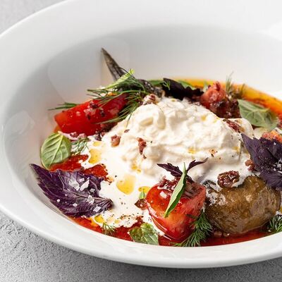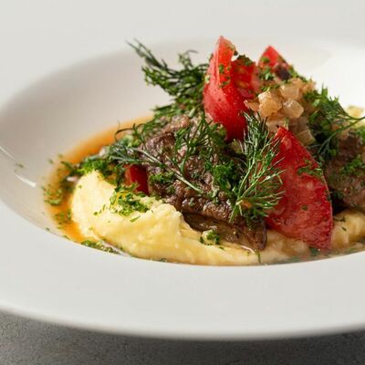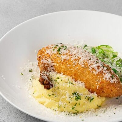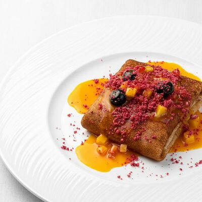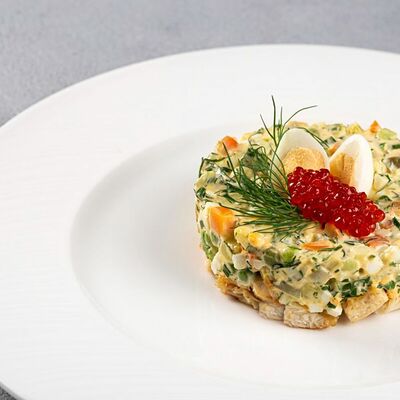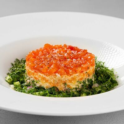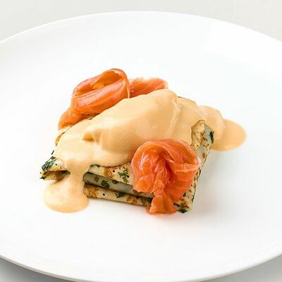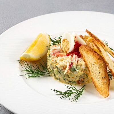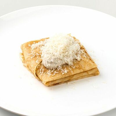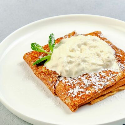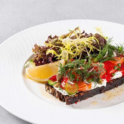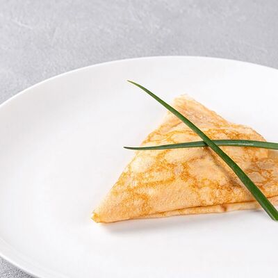 Золотистый блин с начинкой из сёмги собственного посола и сливочного крем-сыра. Изюминкой блюда является авторский пивной соус. Блин подаётся чуть теплым, разогревать не рекомендуем