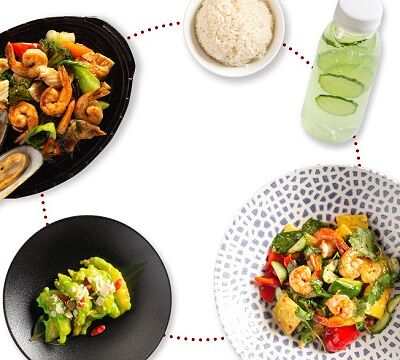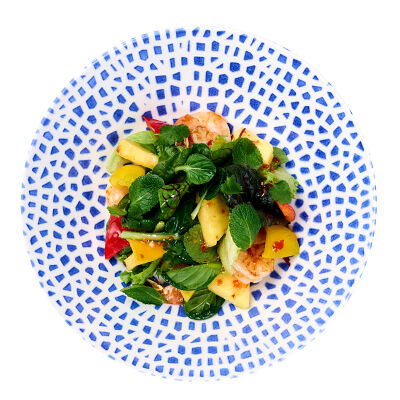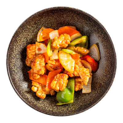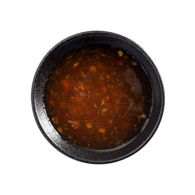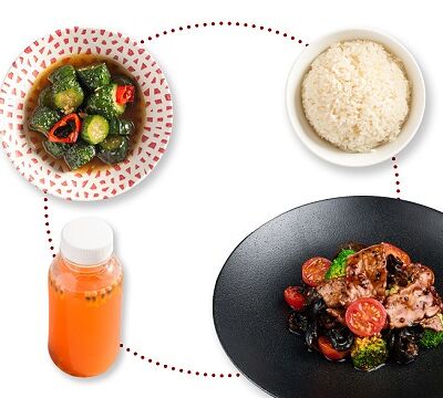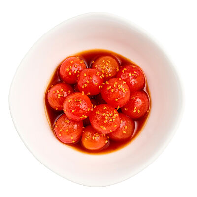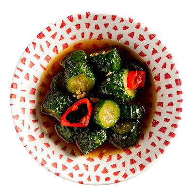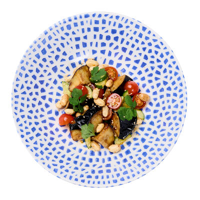 Баклажан, огурец, помидоры черри, кунжут, арахис, соус устричный, кинза, чеснок, рисовый уксус