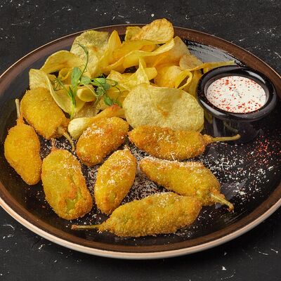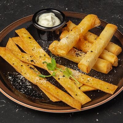 Сыр гауда, тесто фило, сыр грана падано, лепёшка пшеничная сырная, соус блю чиз