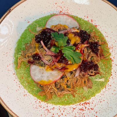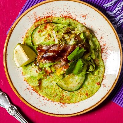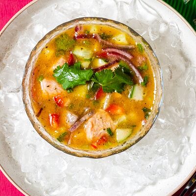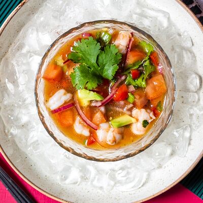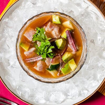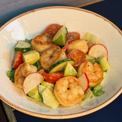 Тунец, авокадо, лук красный, огурцы, маринад из сока лайма, рыбного соуса и специй