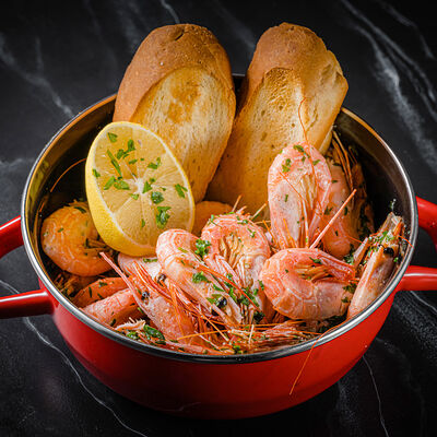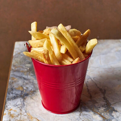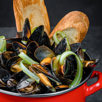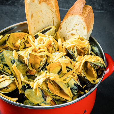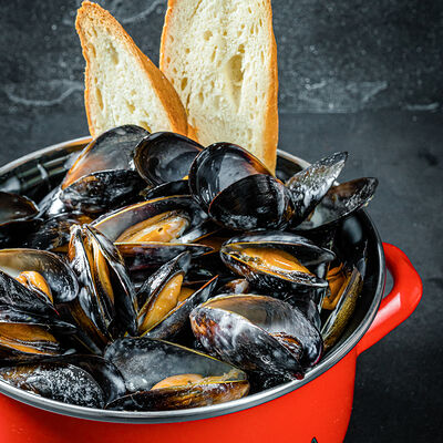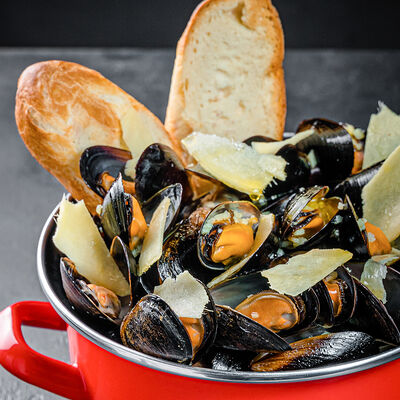Мидии, базилик, оливковое масло, пармезан, кедровый орех, морская вода, чеснок, соль, багет, картофель фри