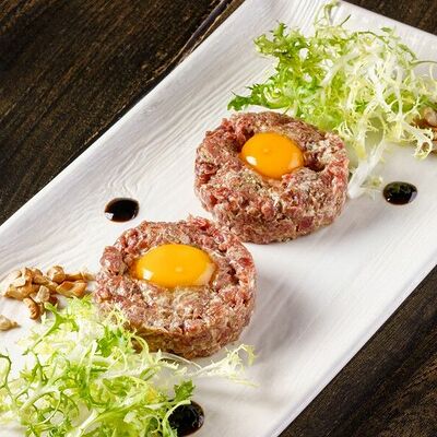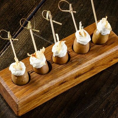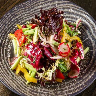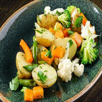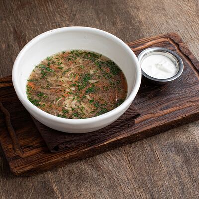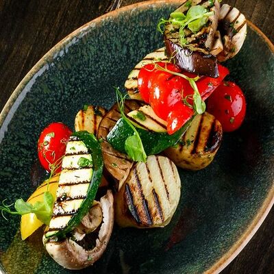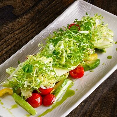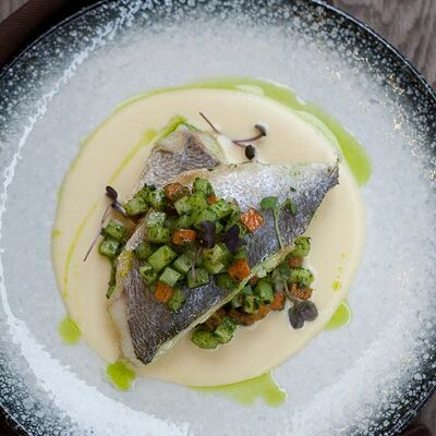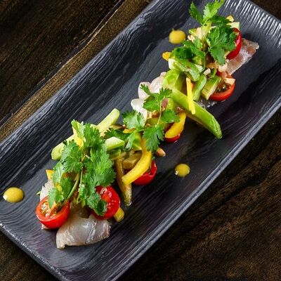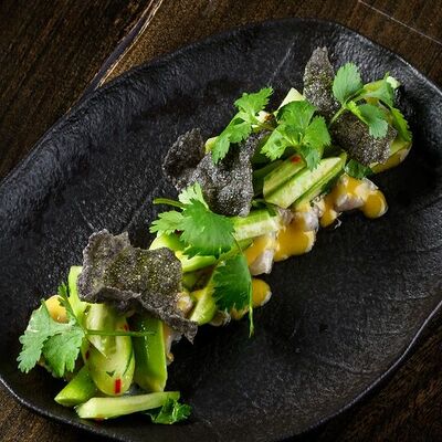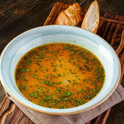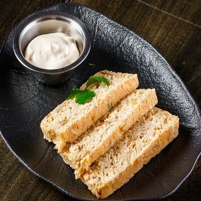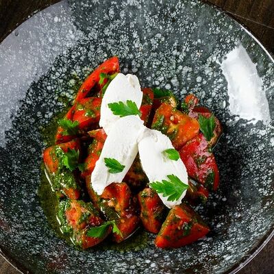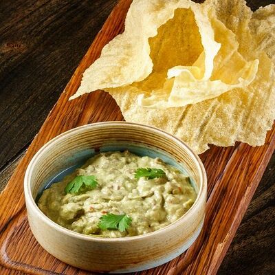 Цыплёнок маринованный, картофель печёный, соус пилати, соус айоли, петрушка, укроп, кинза, соль морская, масло с чесноком и петрушкой